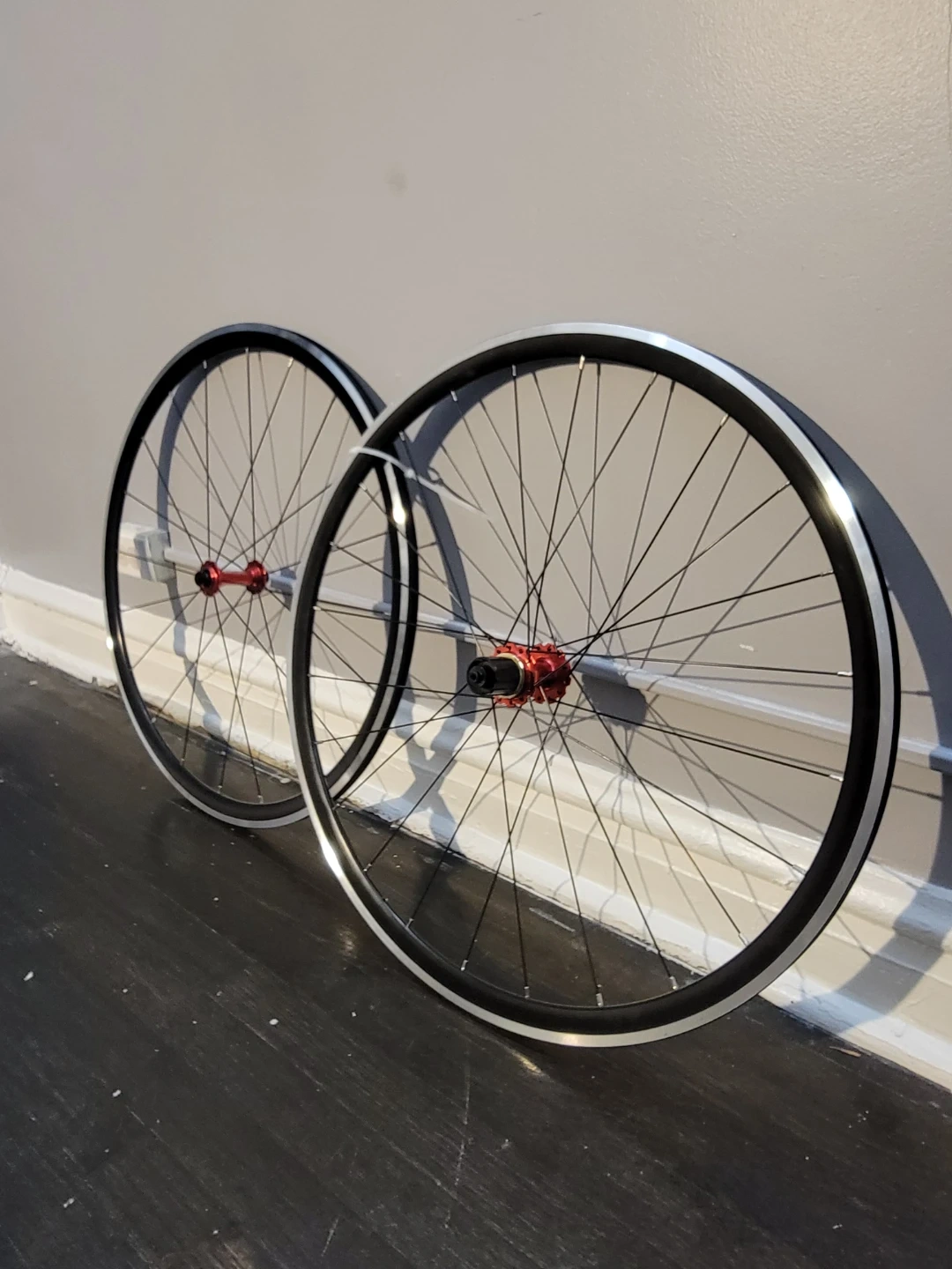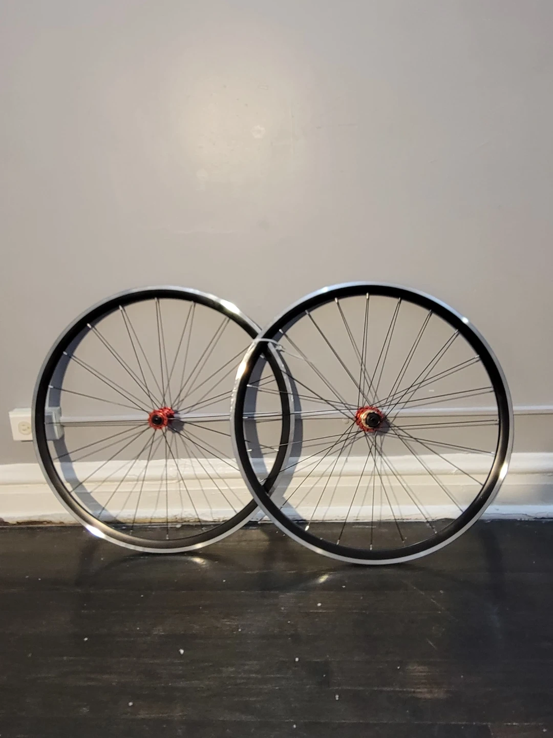 This is a set of 700c road bike wheels. They feature red hubs and black spokes. The rims are silver and black.