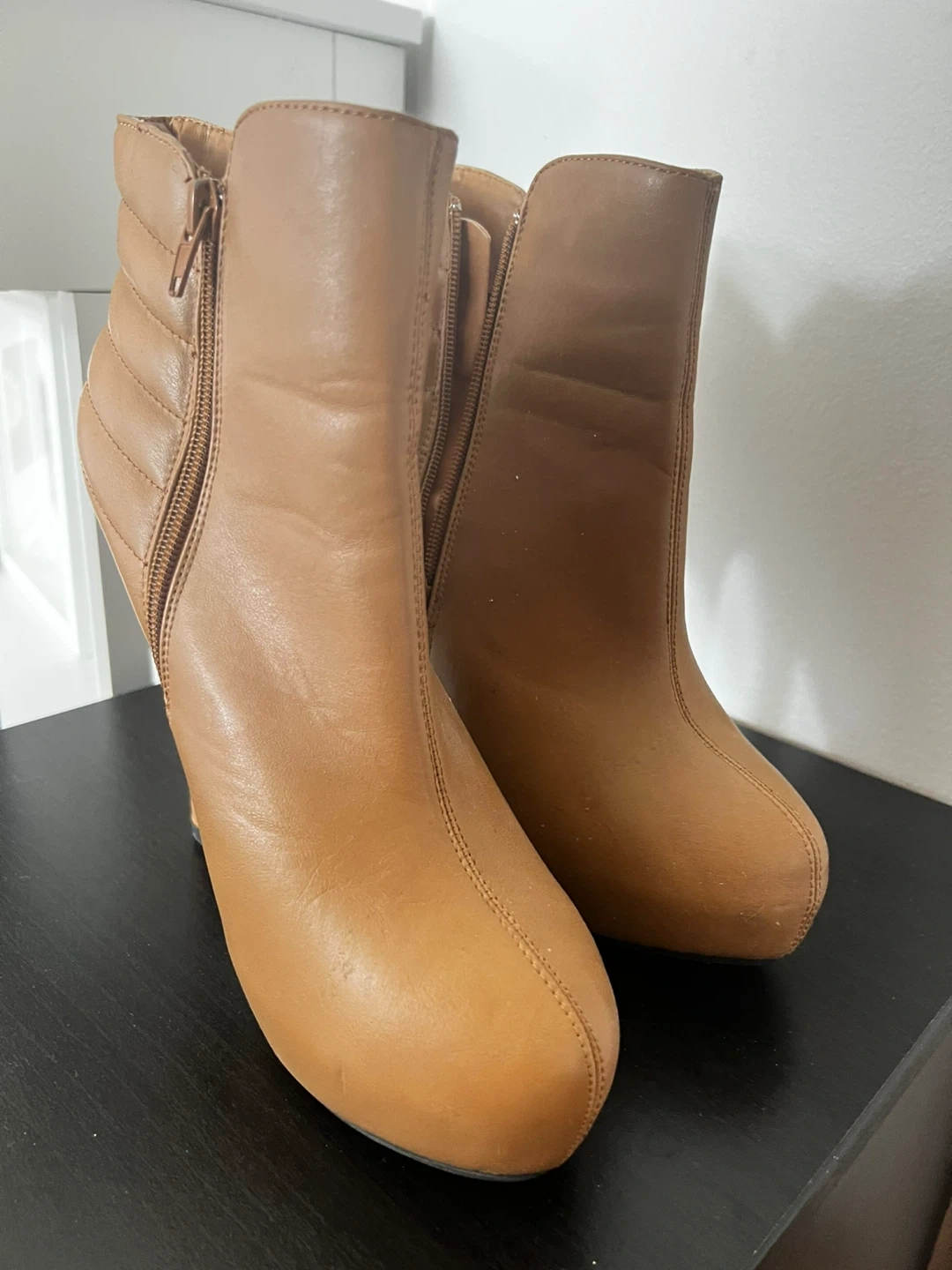 Tan ankle boots with a side zipper and a stylish wedge heel. Upper is man-made material, and the outsole is rubber. These boots are size 8.5. They're great for dressing up an outfit!