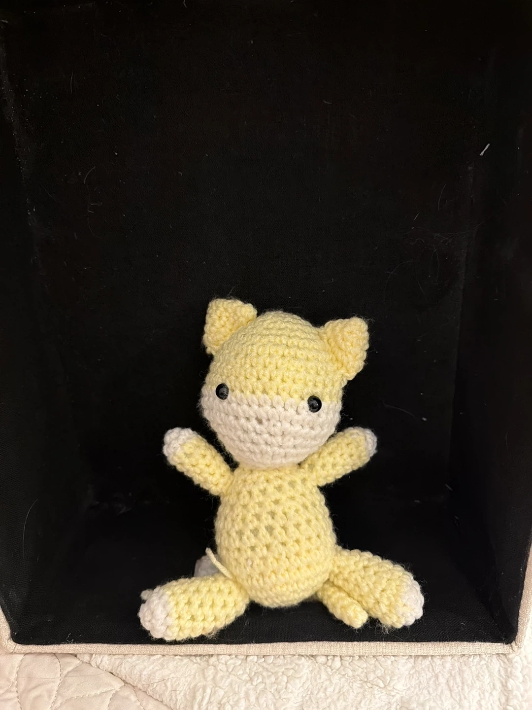 This is a charming handmade crochet toy. It's a yellow animal with white accents on its face and feet. Crafted from soft yarn, it's perfect for a nursery or as a gentle playmate.