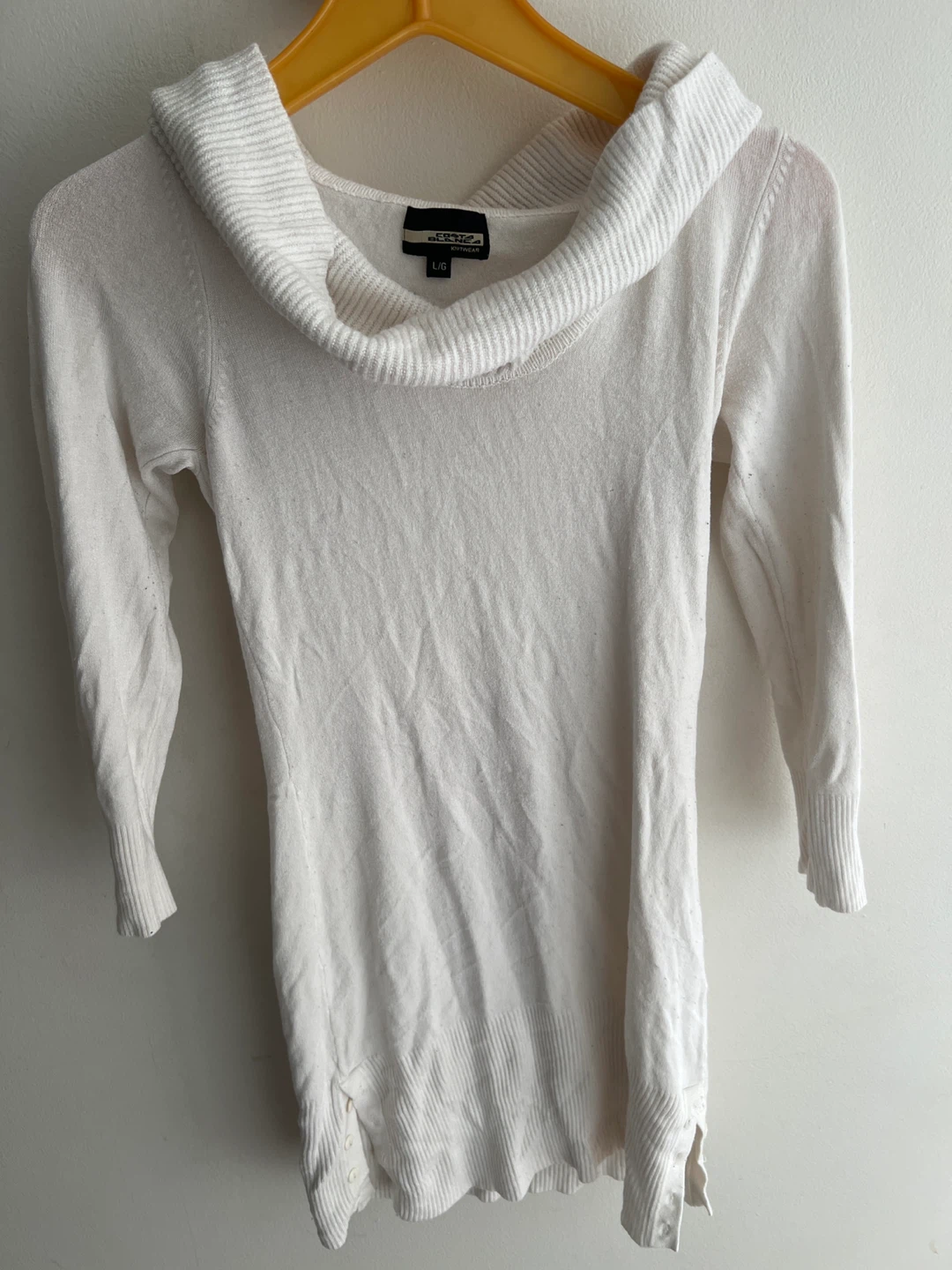 Selling a cream-coloured cowl neck sweater from Costa Blanca. It's a size L/G. It's in great condition and ready for a new home!