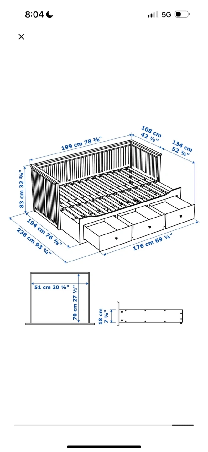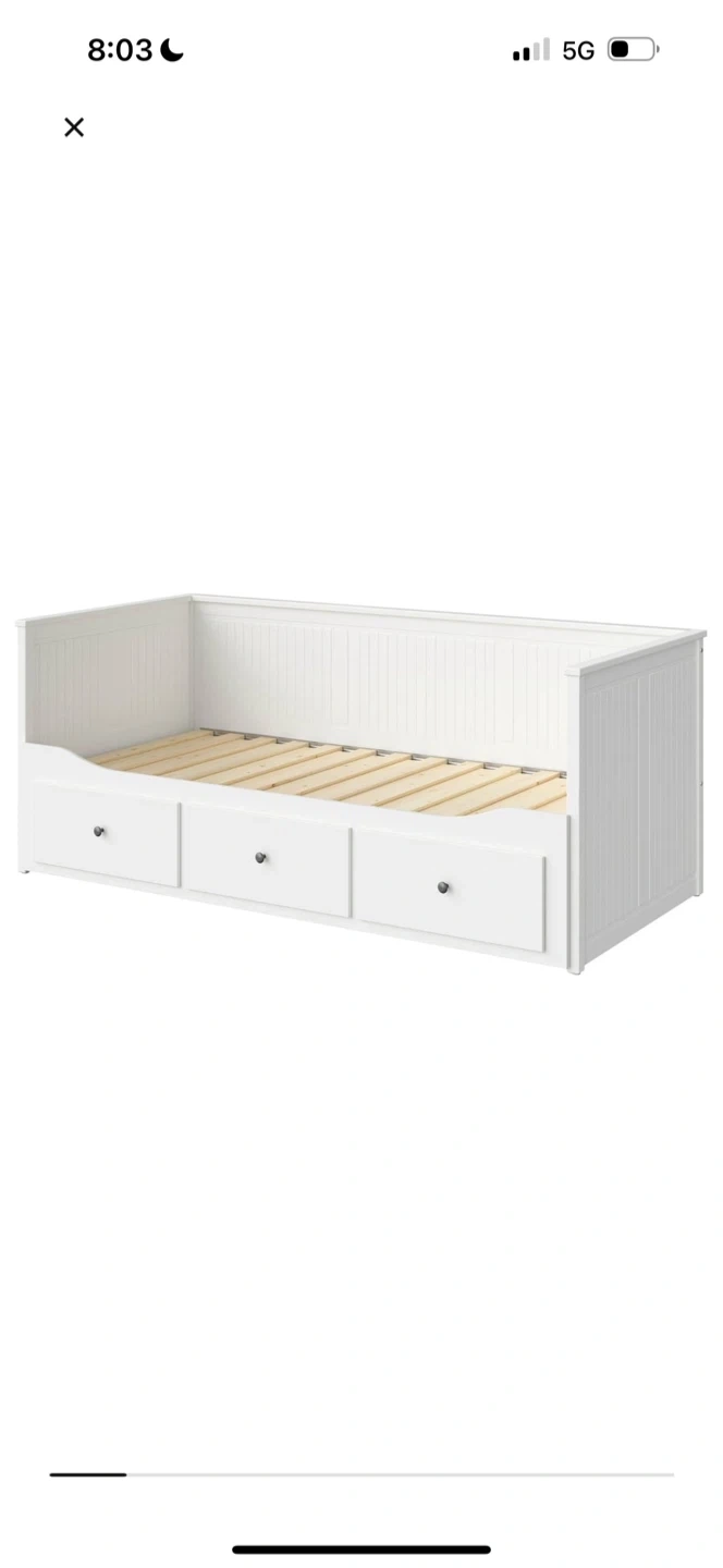 This white daybed by IKEA is a great space-saving solution. It features three built-in drawers for storage. Dimensions are 199 cm long and 108 cm wide. Mattress is not included.