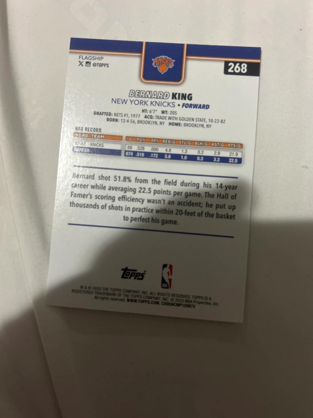 This is a 1977-78 Topps basketball card featuring Bernard King of the New York Knicks, card number 268. Bernard King was a forward drafted by the Nets in 1977. He had a career-high scoring average of 22.5 points per game. This card shows his stats and career achievements.