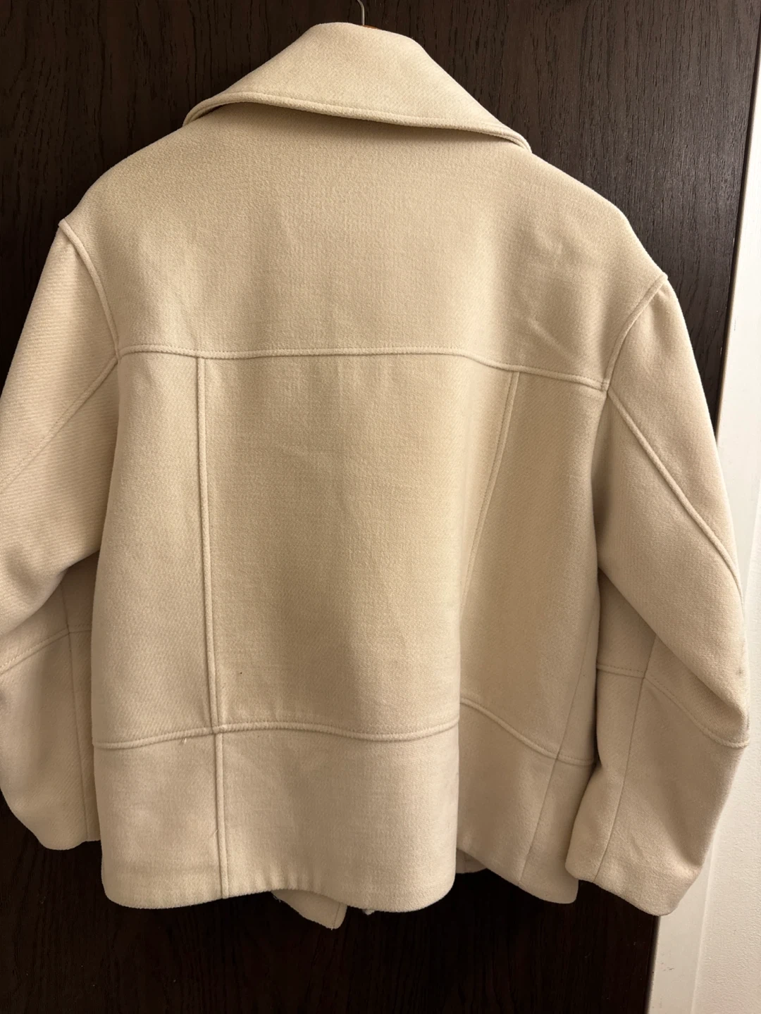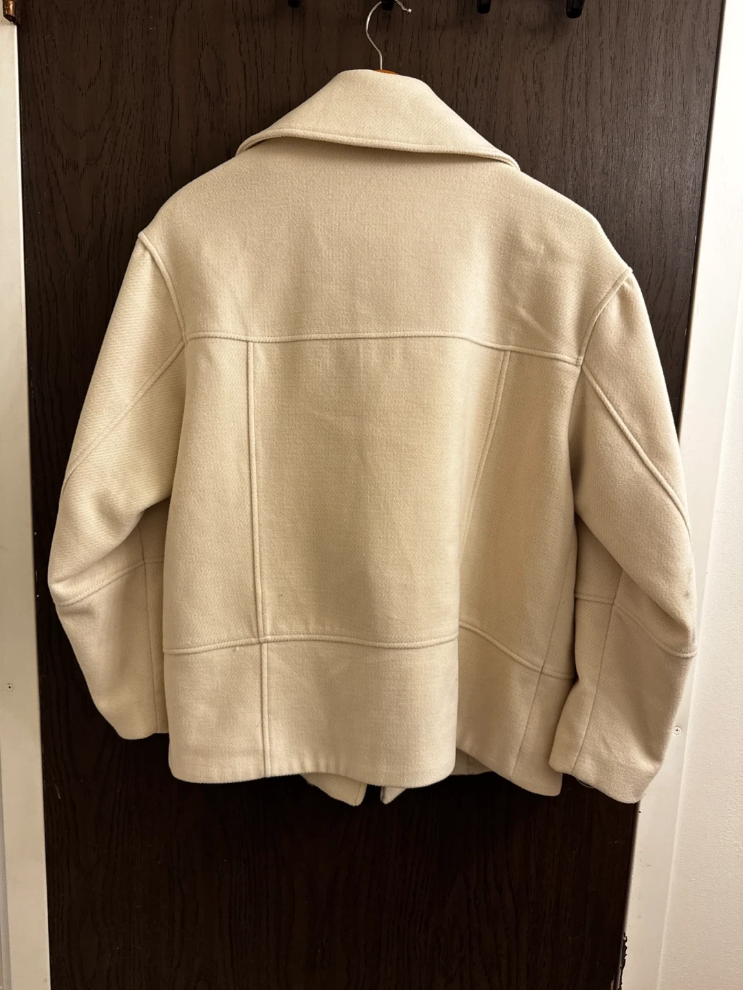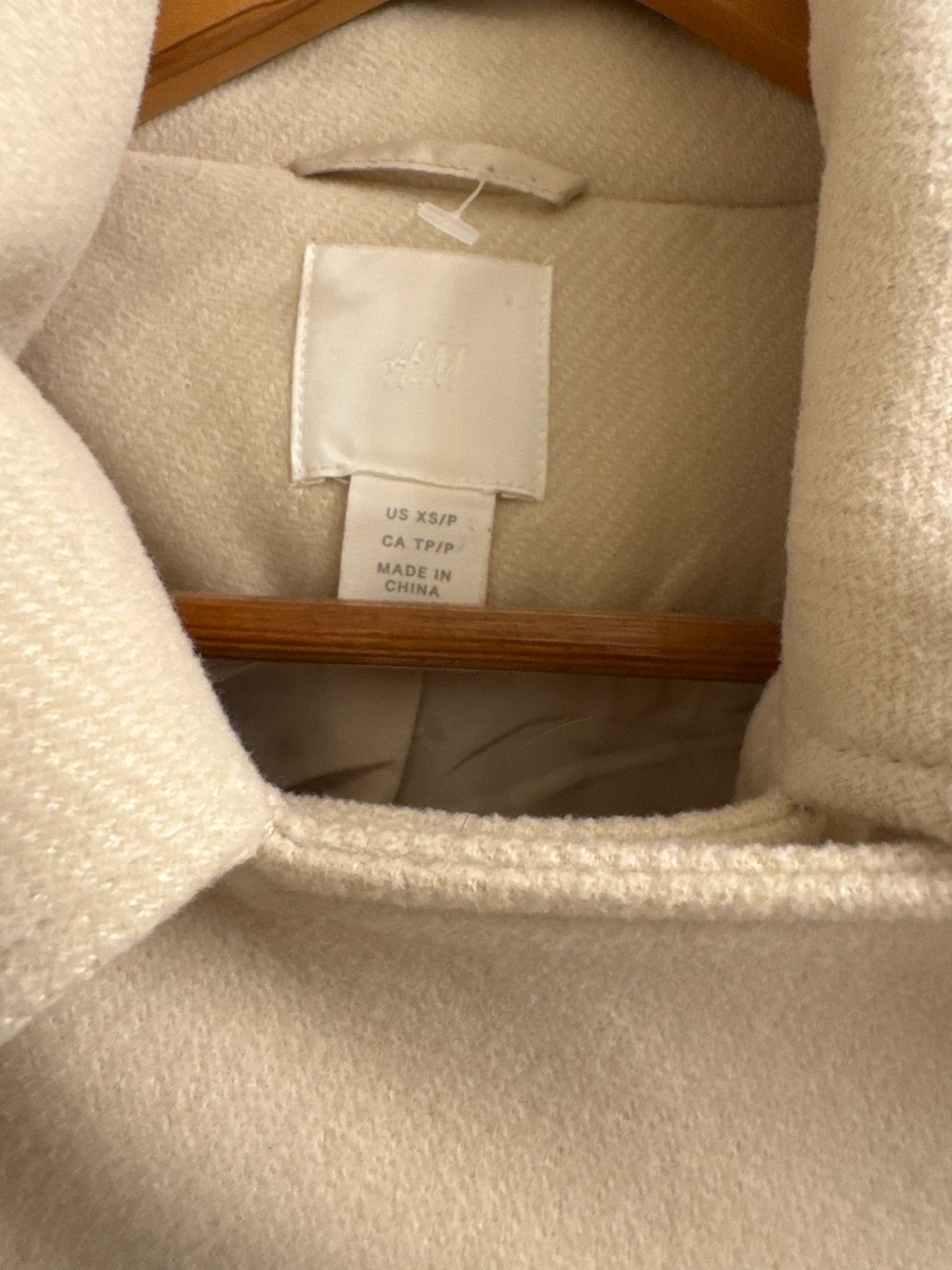 This H&M moto jacket comes in a light beige colour. It's an asymmetrical zip style with metal hardware. The size is XS.