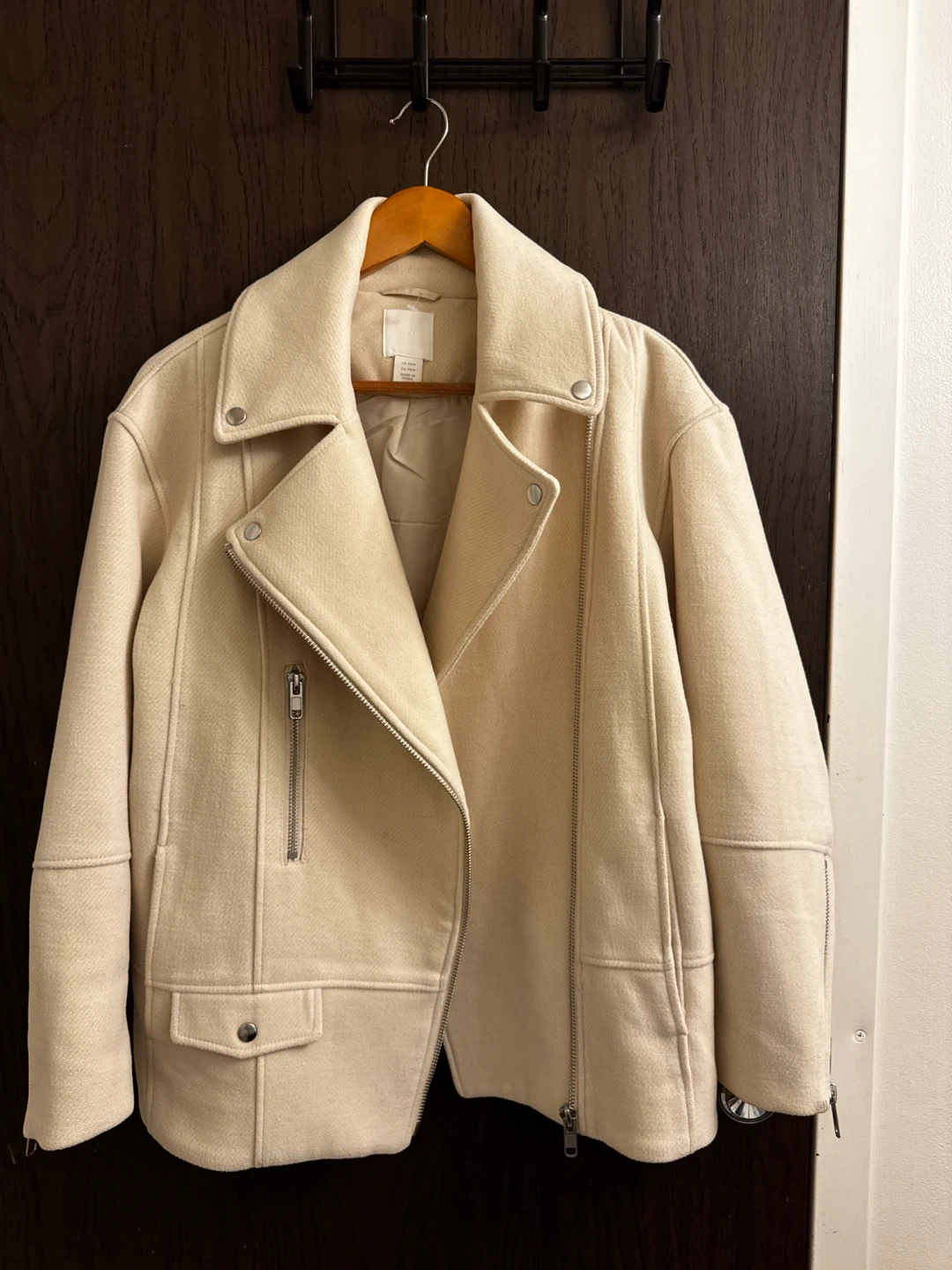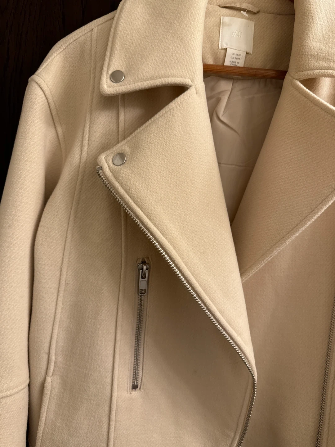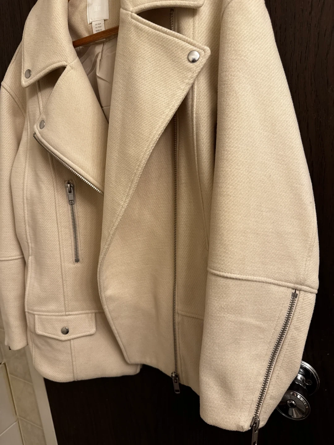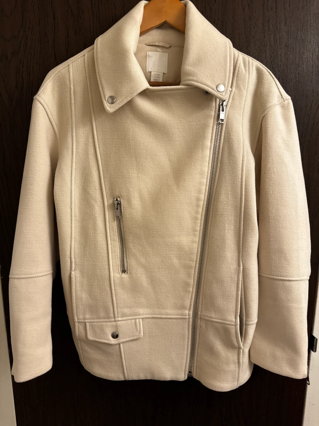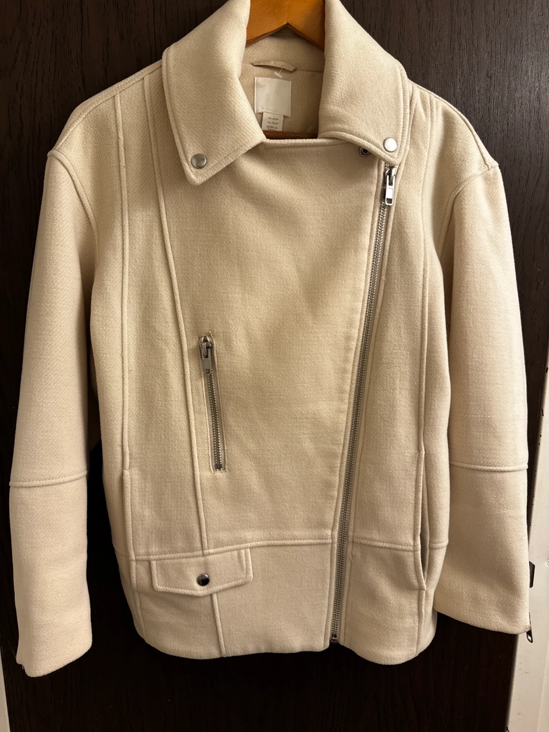 This H&M moto jacket comes in a light beige colour. It's an asymmetrical zip style with metal hardware. The size is XS.
