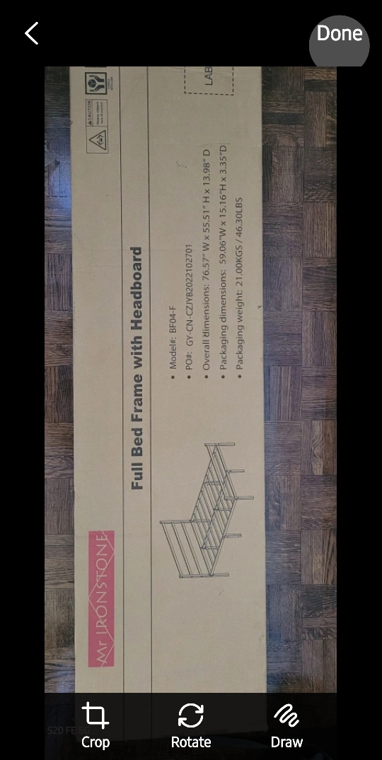 Selling a My Ironstone full bed frame with headboard! The model number is BF04-F. The overall dimensions are 76.57" W x 55.11" H x 13.98" D. Packaging dimensions: 59.06" W x 15.16" H x 3.35" D. Packaging weight: 21.00KGS/46.30LBS. The box is included