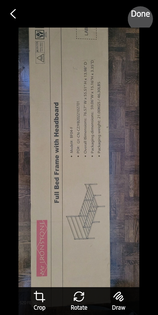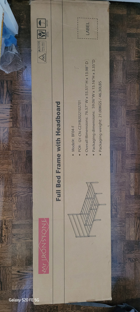 Selling a My Ironstone full bed frame with headboard! The model number is BF04-F. The overall dimensions are 76.57" W x 55.11" H x 13.98" D. Packaging dimensions: 59.06" W x 15.16" H x 3.35" D. Packaging weight: 21.00KGS/46.30LBS. The box is included
