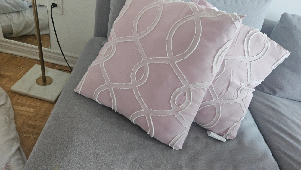 Two decorative throw pillows for sale! One is a light pink with a unique looping design, and the other is a soft beige colour. They're in great shape and would look lovely on a couch or bed.
