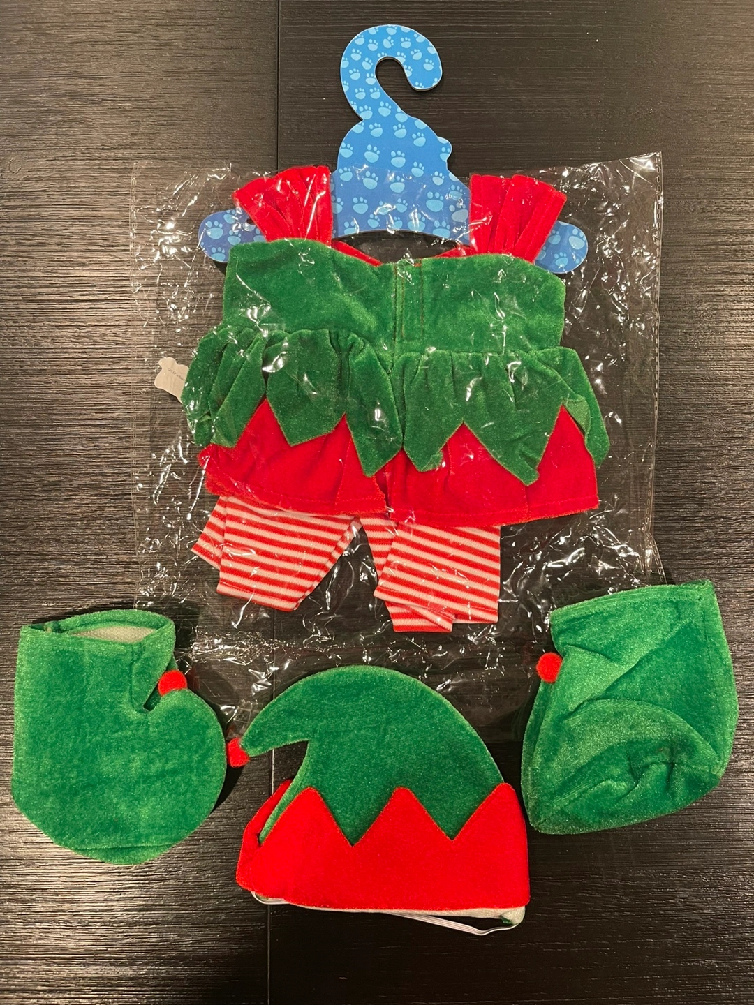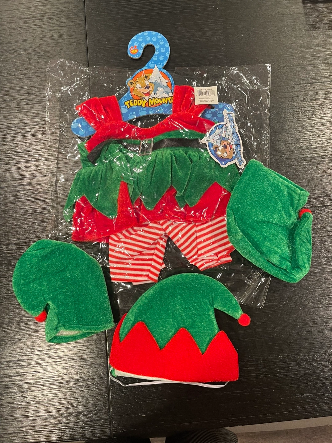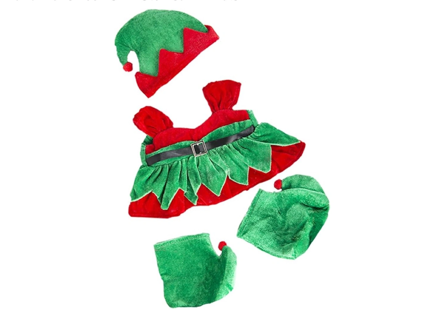 🧡 Adorable elf costume. Includes dress, pants, hat, and boots. Green and red. Fits small stuffed animals. New with tags.