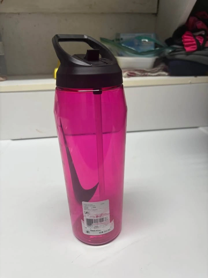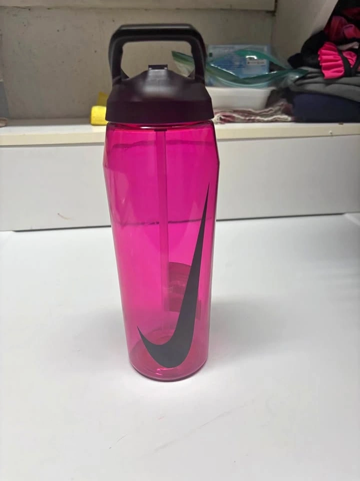 Nike Water Bottle — Brand New / Never Used. Won this in a social prize package, so this one is up for grabs. Nike translucent pink bottle with large swoosh. Flip-top lid with built-in straw (straw is still inside / unused). Carry handle on the lid. Clean, sanitary, and never used. Similar Nike bottles typically sell around $14+ on Nike’s site, and a Nike Hypercharge 32oz straw bottle is listed around $19.99 at Walmart, so $10 is a quick, solid deal.