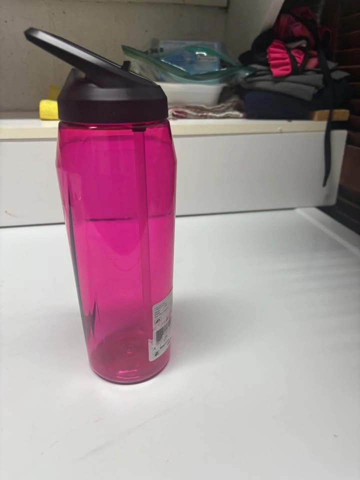 Nike Water Bottle — Brand New / Never Used. Won this in a social prize package, so this one is up for grabs. Nike translucent pink bottle with large swoosh. Flip-top lid with built-in straw (straw is still inside / unused). Carry handle on the lid. Clean, sanitary, and never used. Similar Nike bottles typically sell around $14+ on Nike’s site, and a Nike Hypercharge 32oz straw bottle is listed around $19.99 at Walmart, so $10 is a quick, solid deal.