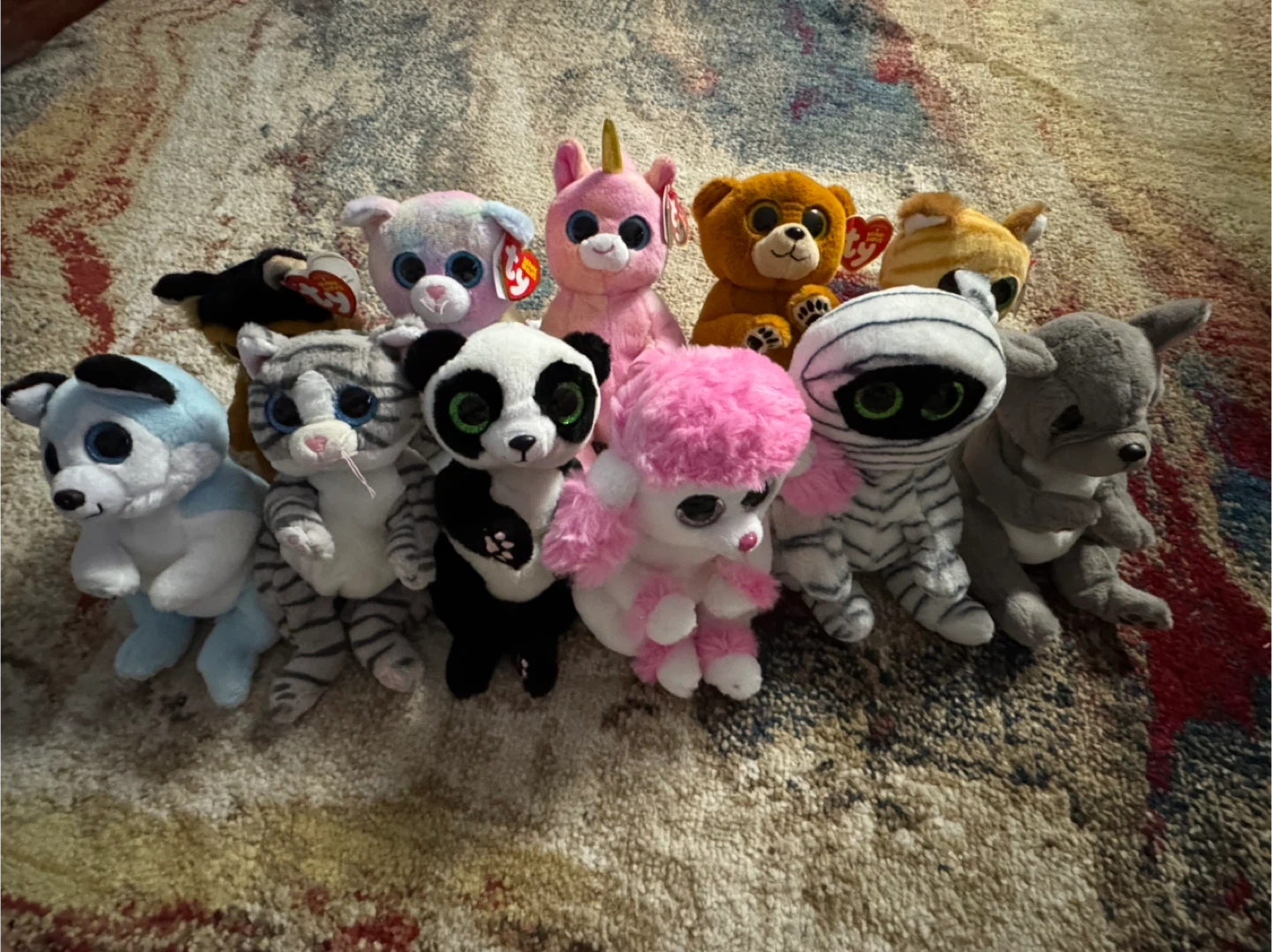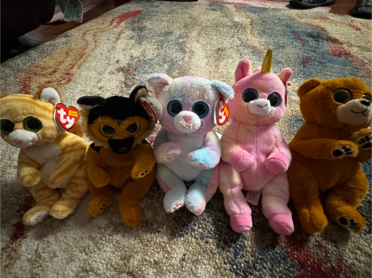 A collection of five Ty Beanie Bellies plush toys featuring various animals like cats, dogs, and a unicorn. Each plush has the signature large, colourful eyes. These are soft, cuddly toys perfect for collectors or children's playtime.