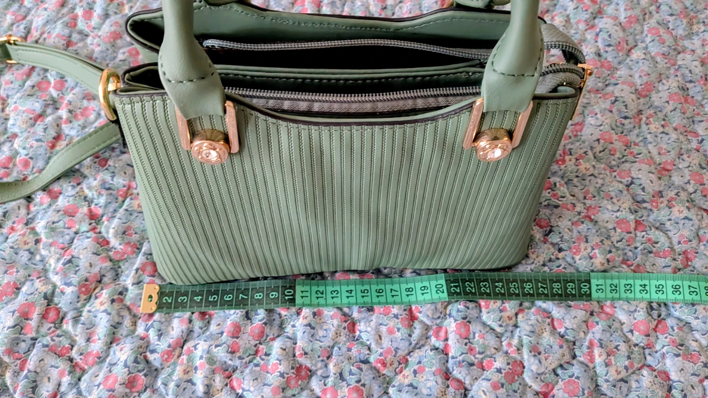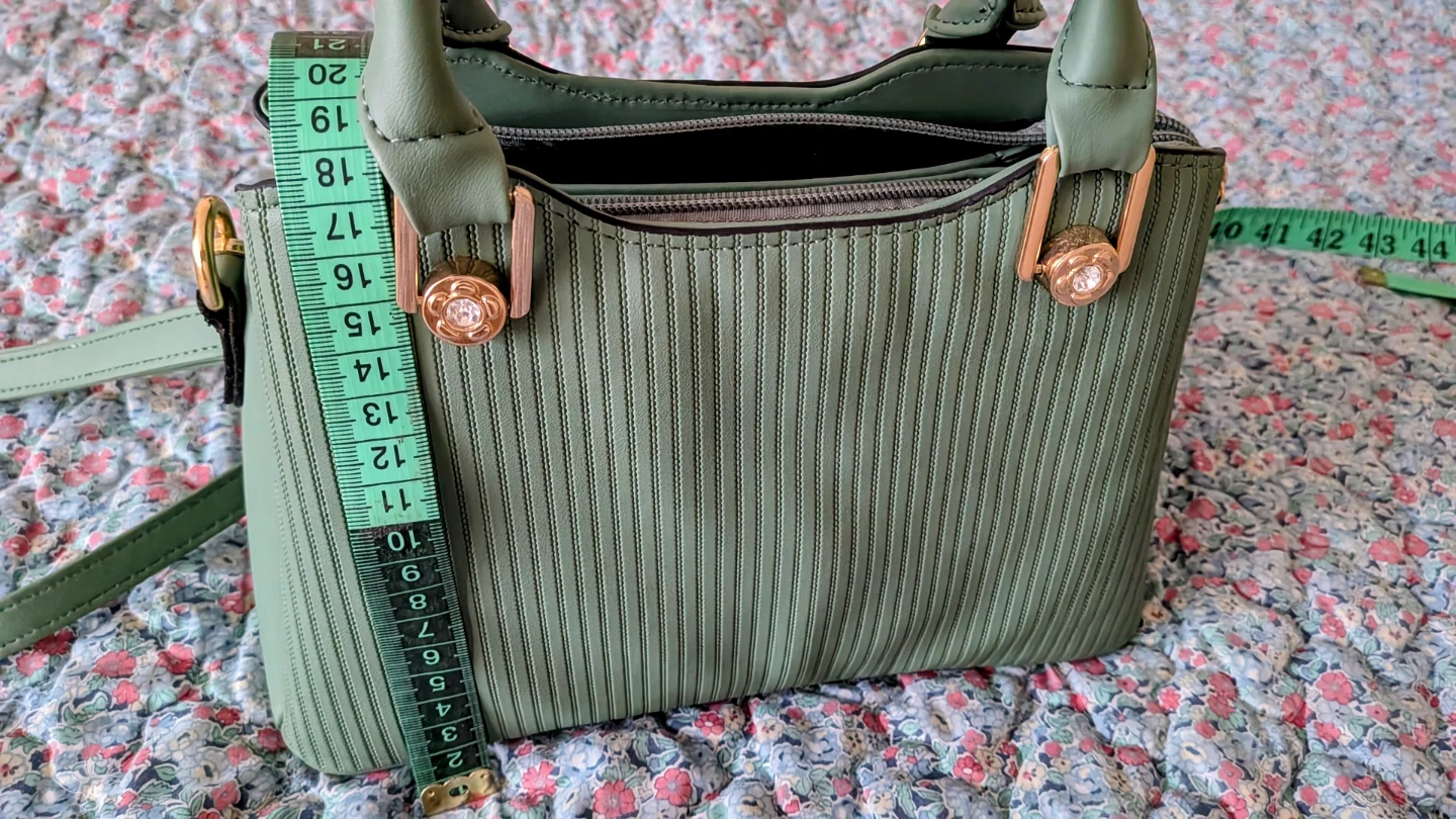 This green faux leather satchel handbag features a textured exterior and gold-tone hardware. It has a zip-top closure and multiple interior compartments. Includes a detachable, adjustable shoulder strap. Approx. 26cm wide and 18cm tall.