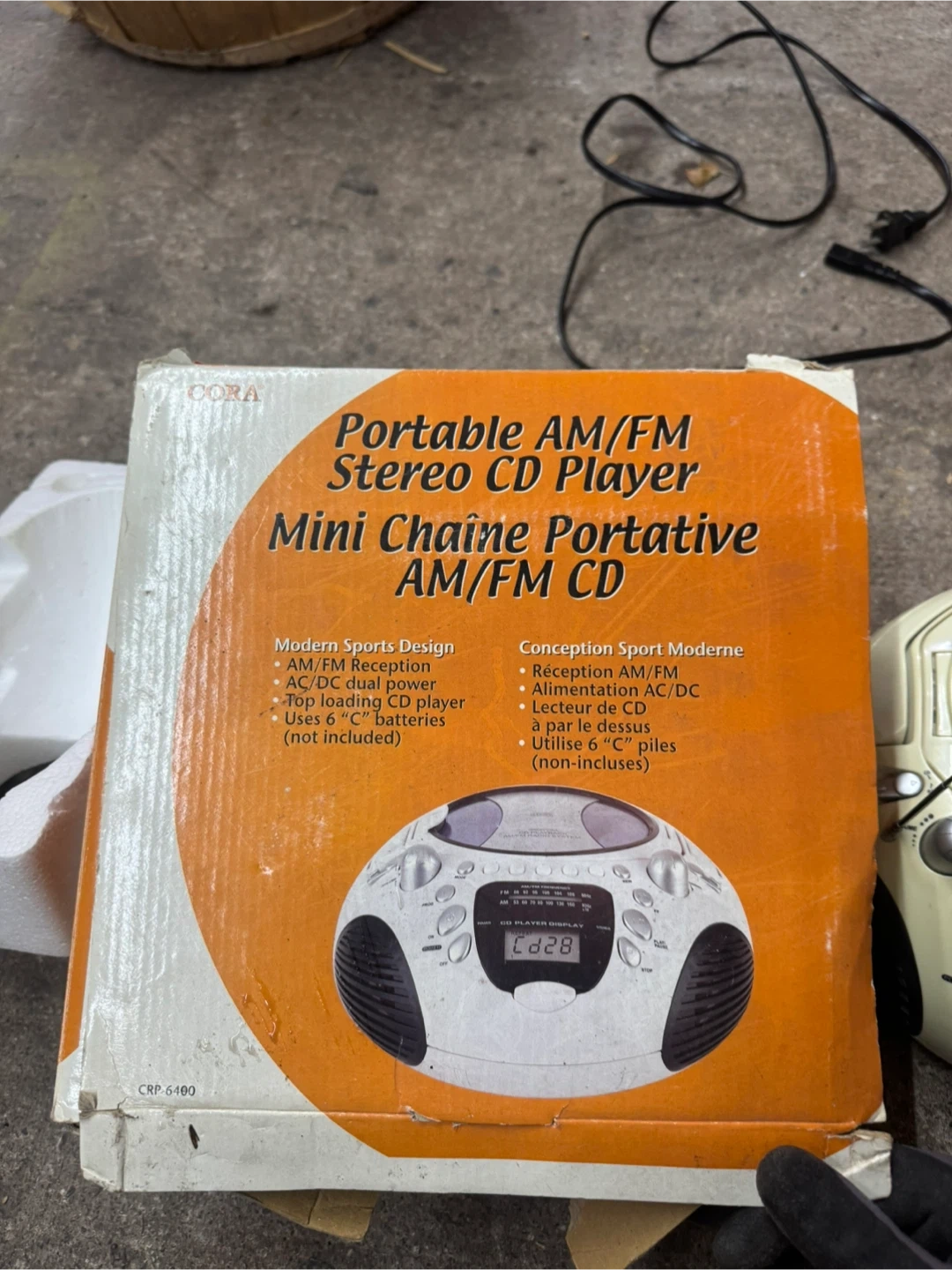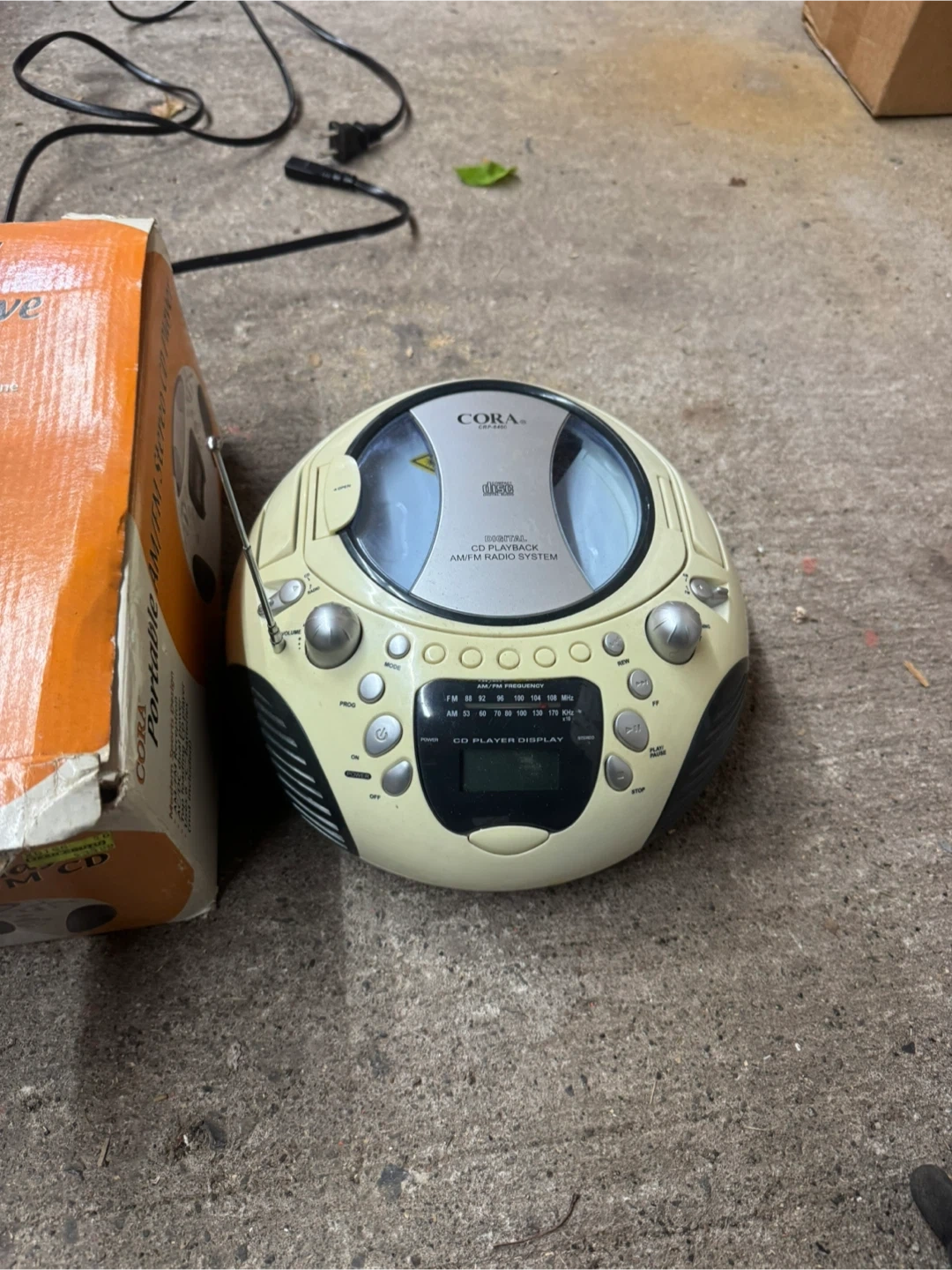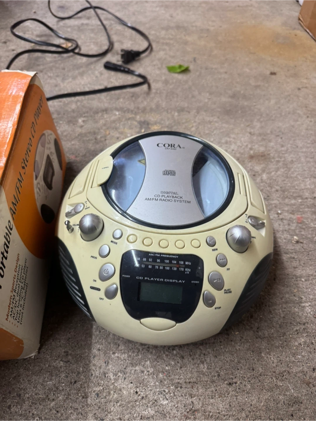 Selling a Cora portable AM/FM stereo CD player. It has a top-loading CD player and can be powered by AC/DC or 6 "C" batteries (not included). Comes with the original box!