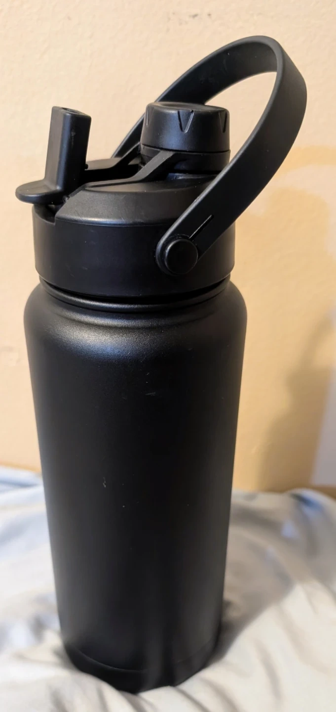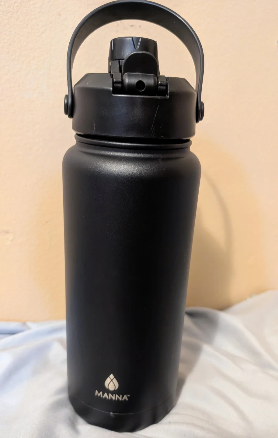 This is a black Manna insulated water bottle with a top handle. It's a 32-oz capacity. Stainless steel construction. It's in good condition.