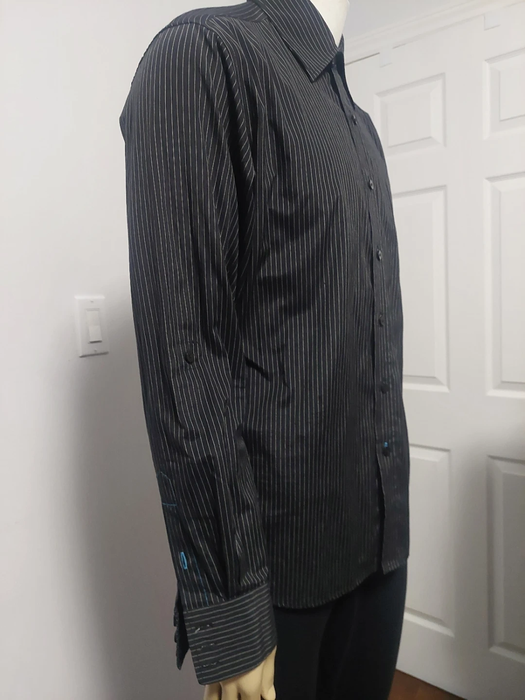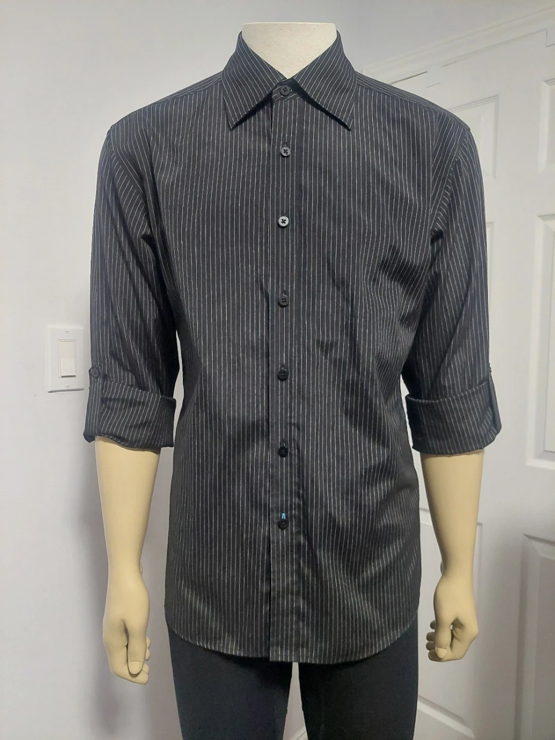 Classic charcoal grey dress shirt with a subtle pinstripe pattern. It's made from a blend of 55% polyester and 45% cotton for comfort. This shirt is great for business casual or formal occasions.