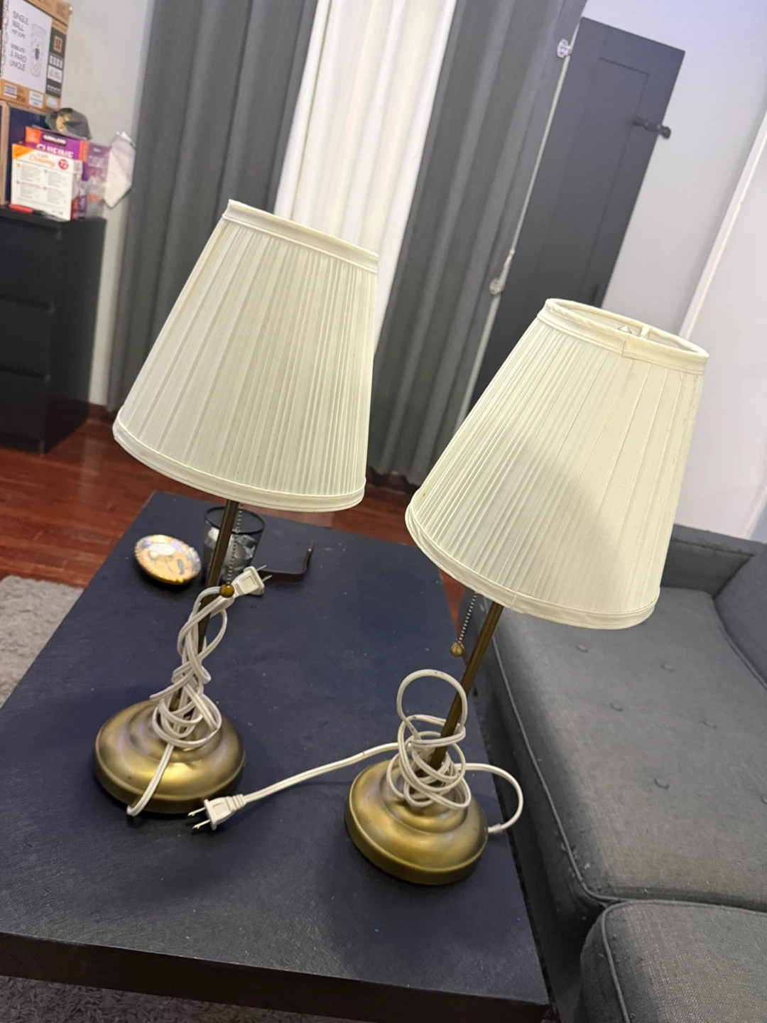 Selling two IKEA ÅRSTID table lamps in brass and white. These lamps have a classic pleated shade and a pull-chain switch. They're a great size for bedside tables or desks. Come with cords and plugs.