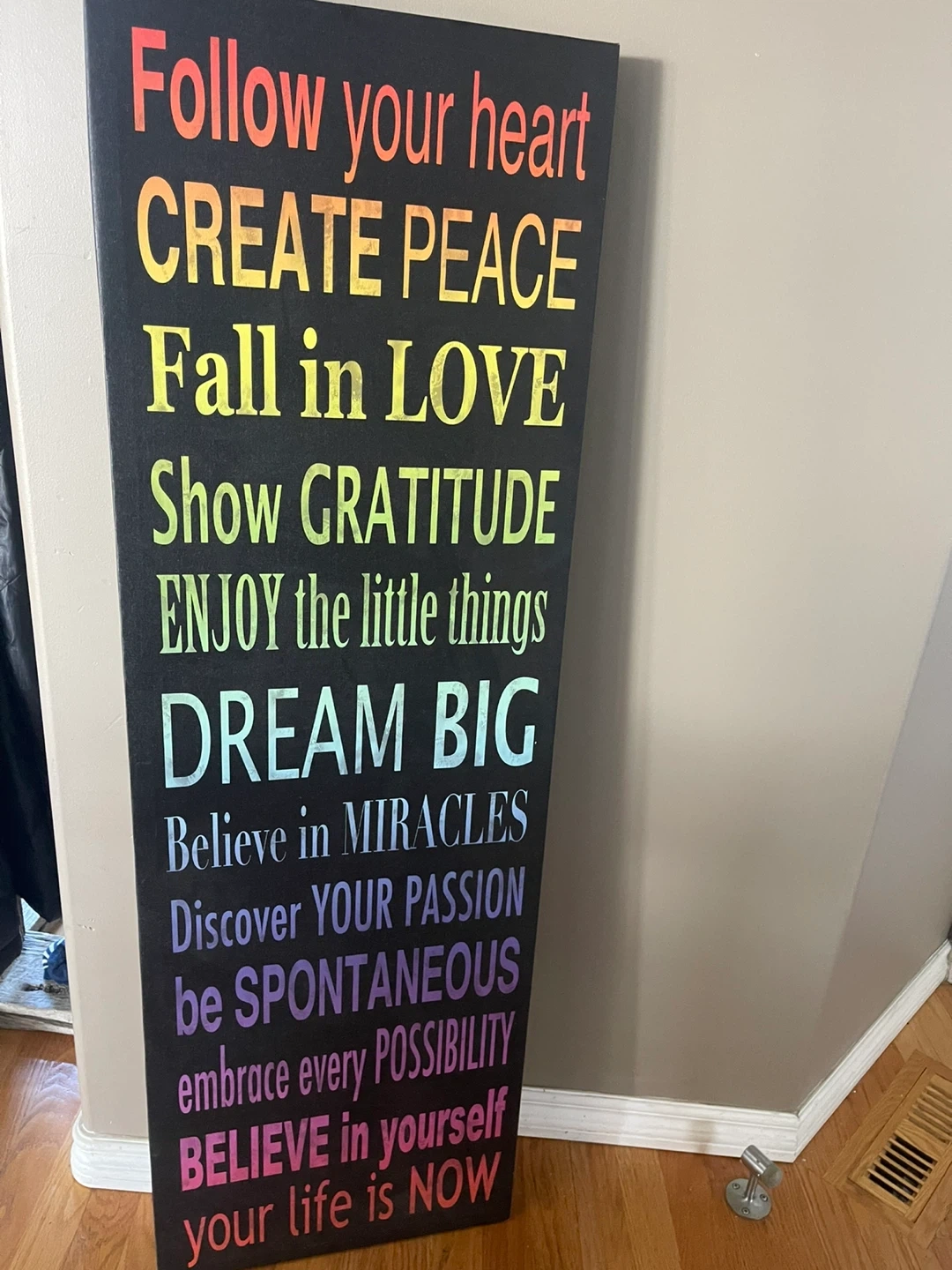 This canvas features motivational phrases in a rainbow gradient. Phrases include 'Follow your heart', 'CREATE PEACE', 'Fall in LOVE', and 'DREAM BIG'. It's a great piece to brighten up any room!