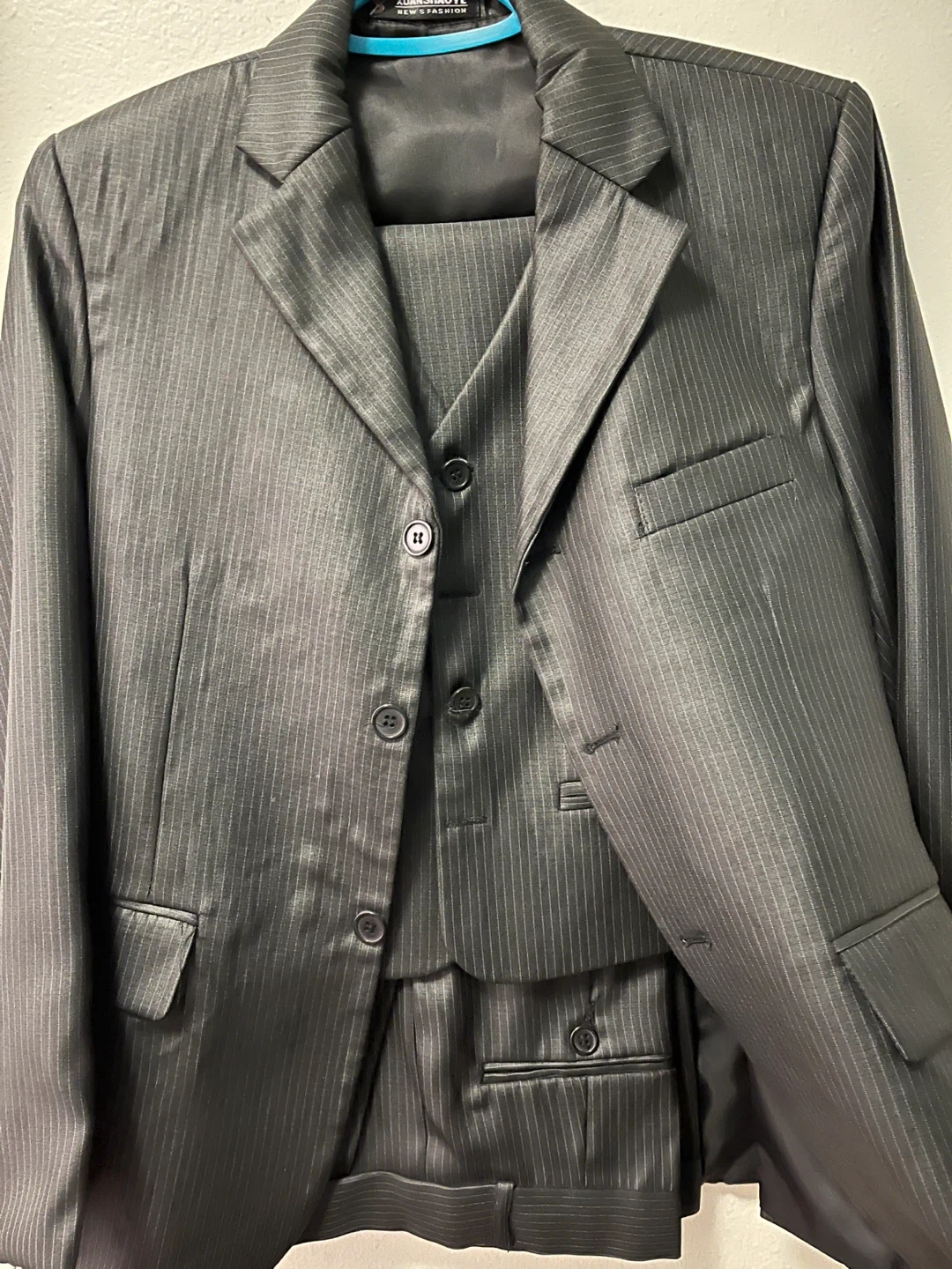 Boy’s/youth (for age 12/13) 3-piece pinstripe suit set. Includes a jacket, matching vest, and dress pants. Classic charcoal grey with subtle vertical pinstripes. Great for formal occasions!