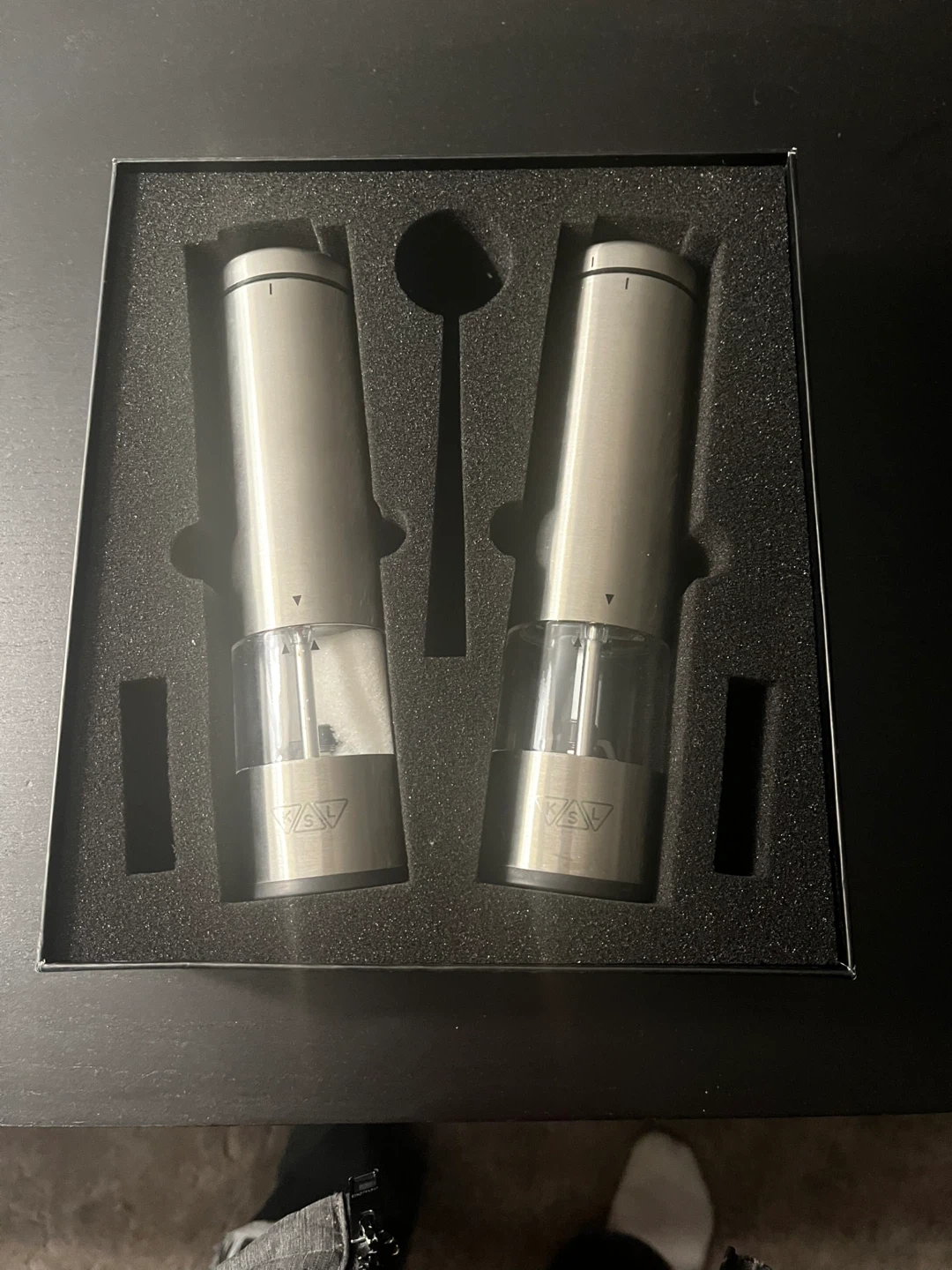 This is a set of two electric grinders. They are made of stainless steel and come in their original box. Grinders are useful for seasoning your meals with freshly ground spices.