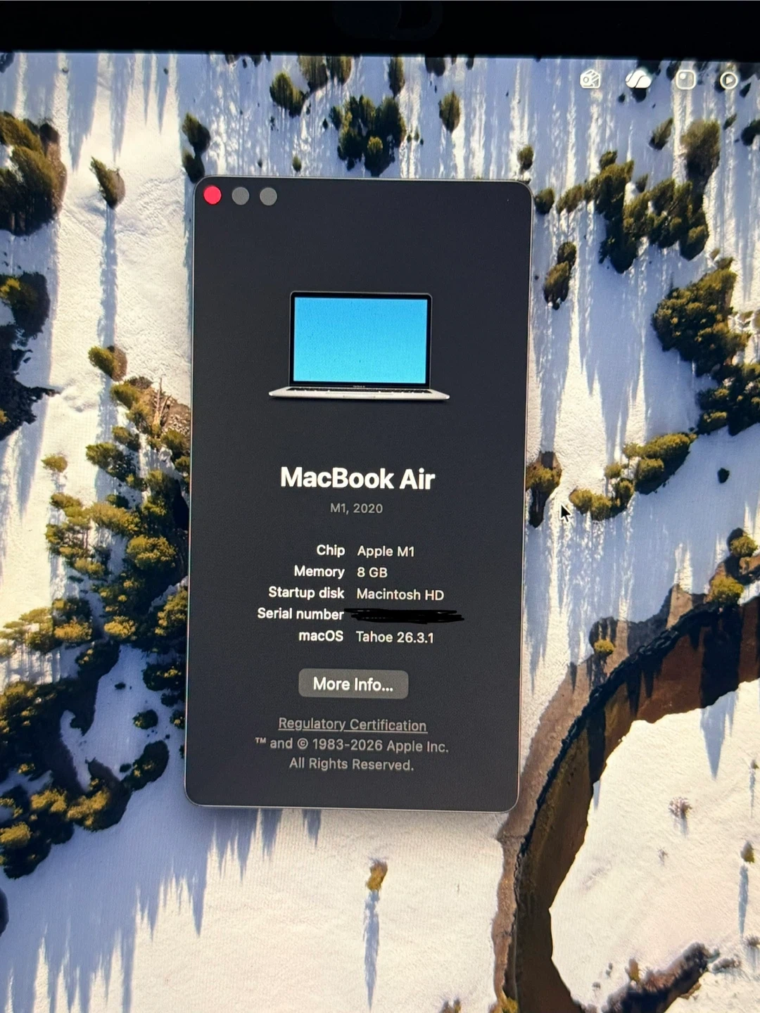MacBook Air M1, 2020 model with 8 GB RAM and 500 GB storage. It has a 13.3-inch Retina display. Battery condition is normal with 84% maximum capacity.