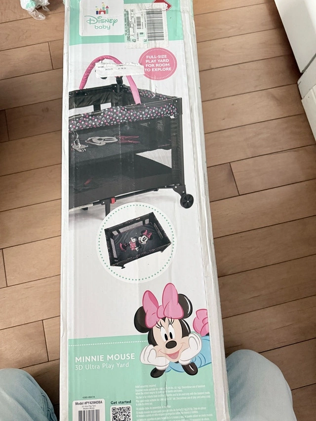 I'm selling a Minnie Mouse 3D Ultra Play Yard. This portable play yard is in good condition. It features a full-size bassinet, an entertaining play bar with 2 Minnie toys, and cute Minnie graphics. If the ad is up, it's available!