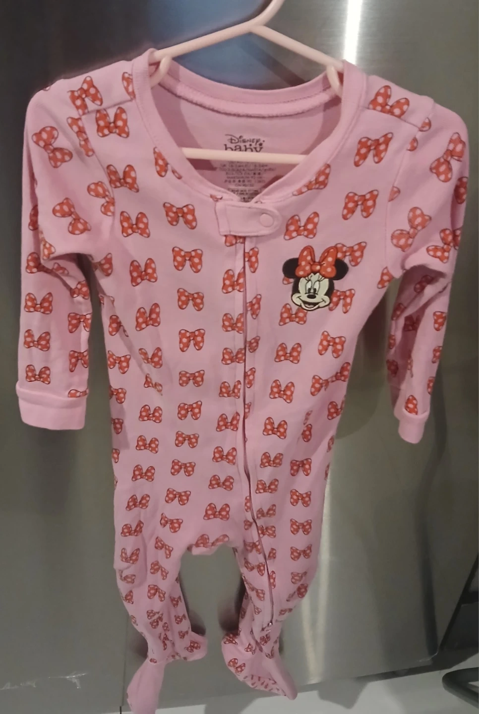 Adorable pink Disney Baby footed pajamas featuring a repeating Minnie Mouse bow print. It's a size 6-9 months and made of soft cotton. Perfect for keeping your little one cozy!