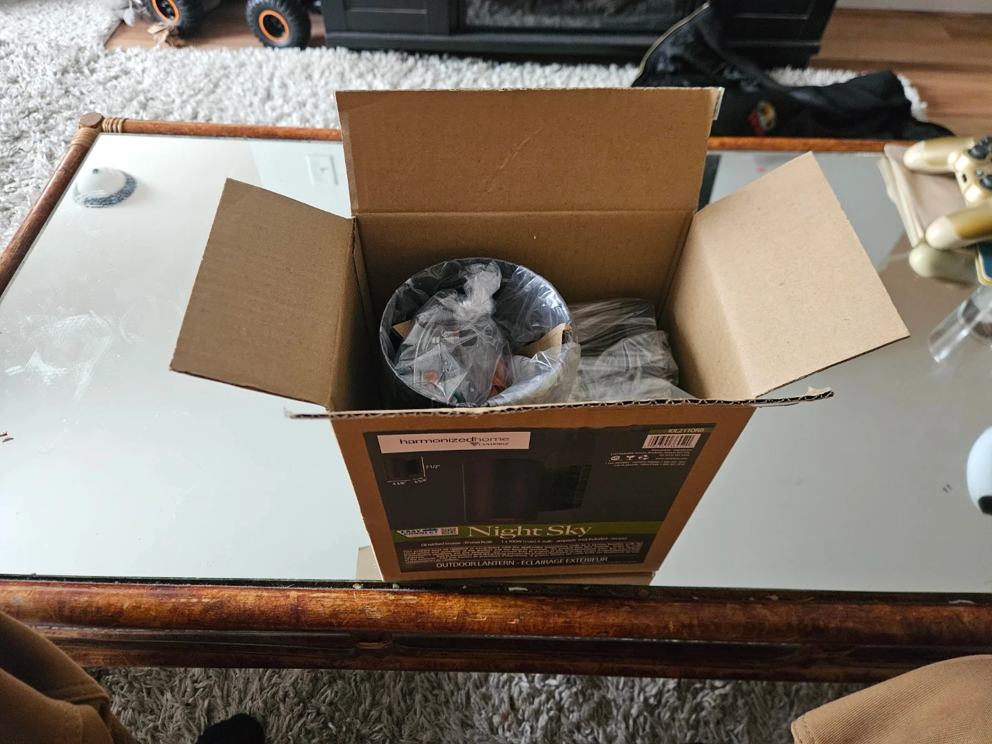 This Harmonized Home Night Sky outdoor lantern is oil rubbed bronze. It takes one 100W (max) bulb, not included. Dimensions are 7 1/2 inches tall with a 4 3/8 inch width and 6 3/4 inch depth.
