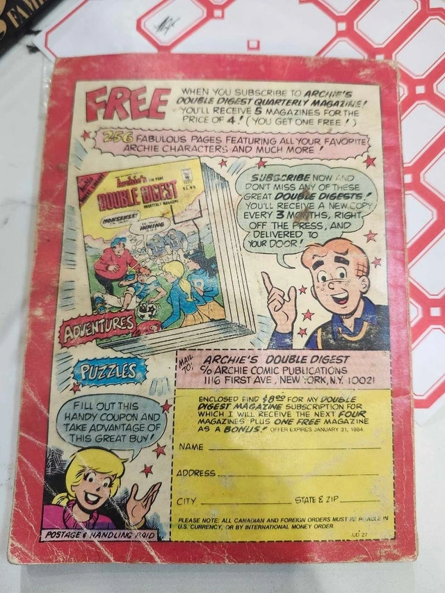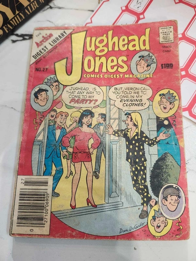 This is a Jughead Jones comic, digest magazine #27. It's a fun piece of Archie Comics history for any collector! Being a previously loved comic, it shows wear and tear around the edges, adding to its vintage charm. Priced with a touch of nostalgia and a whole lot of fun! If the ad is up, it's still available! Cash accepted.