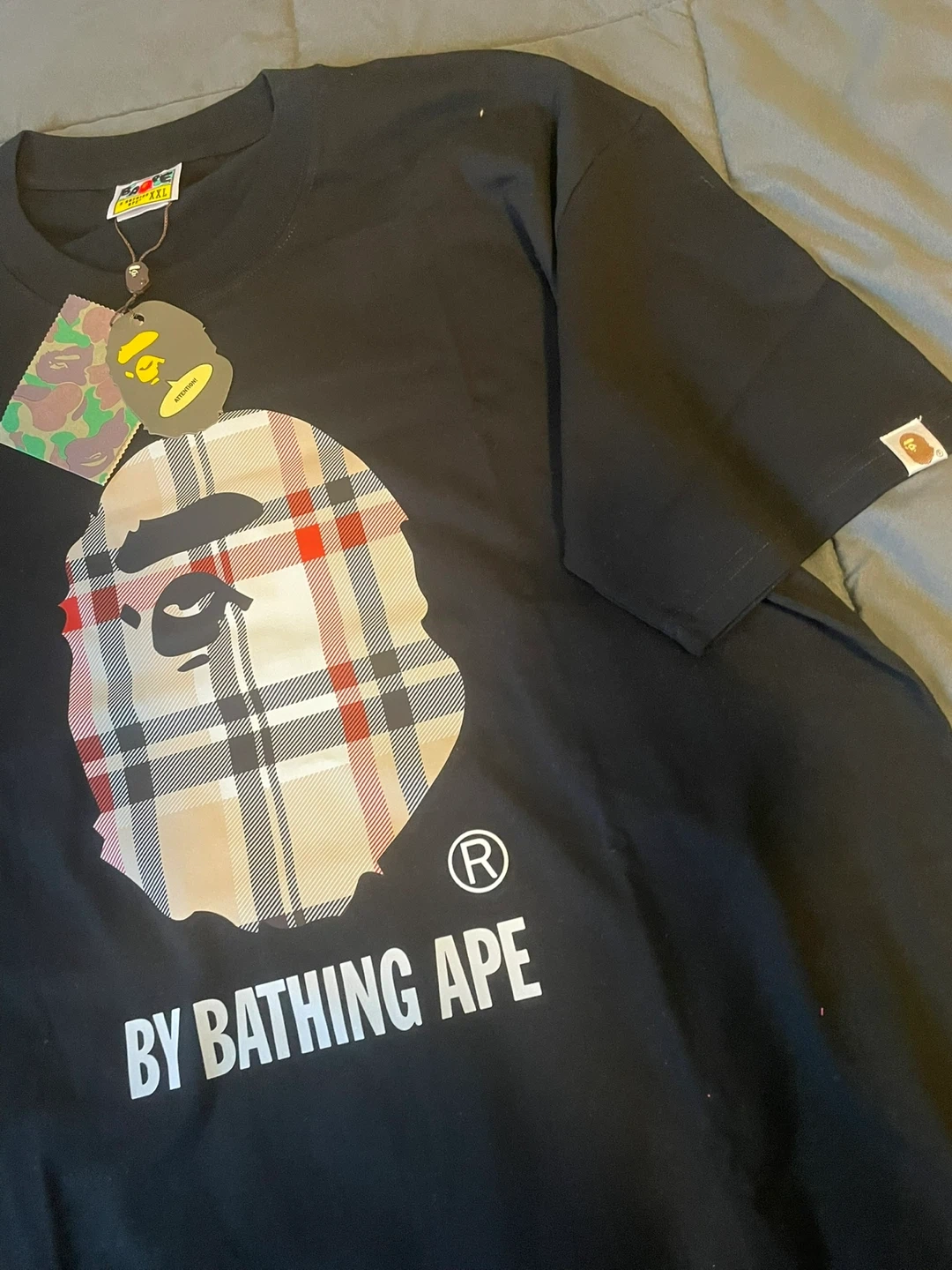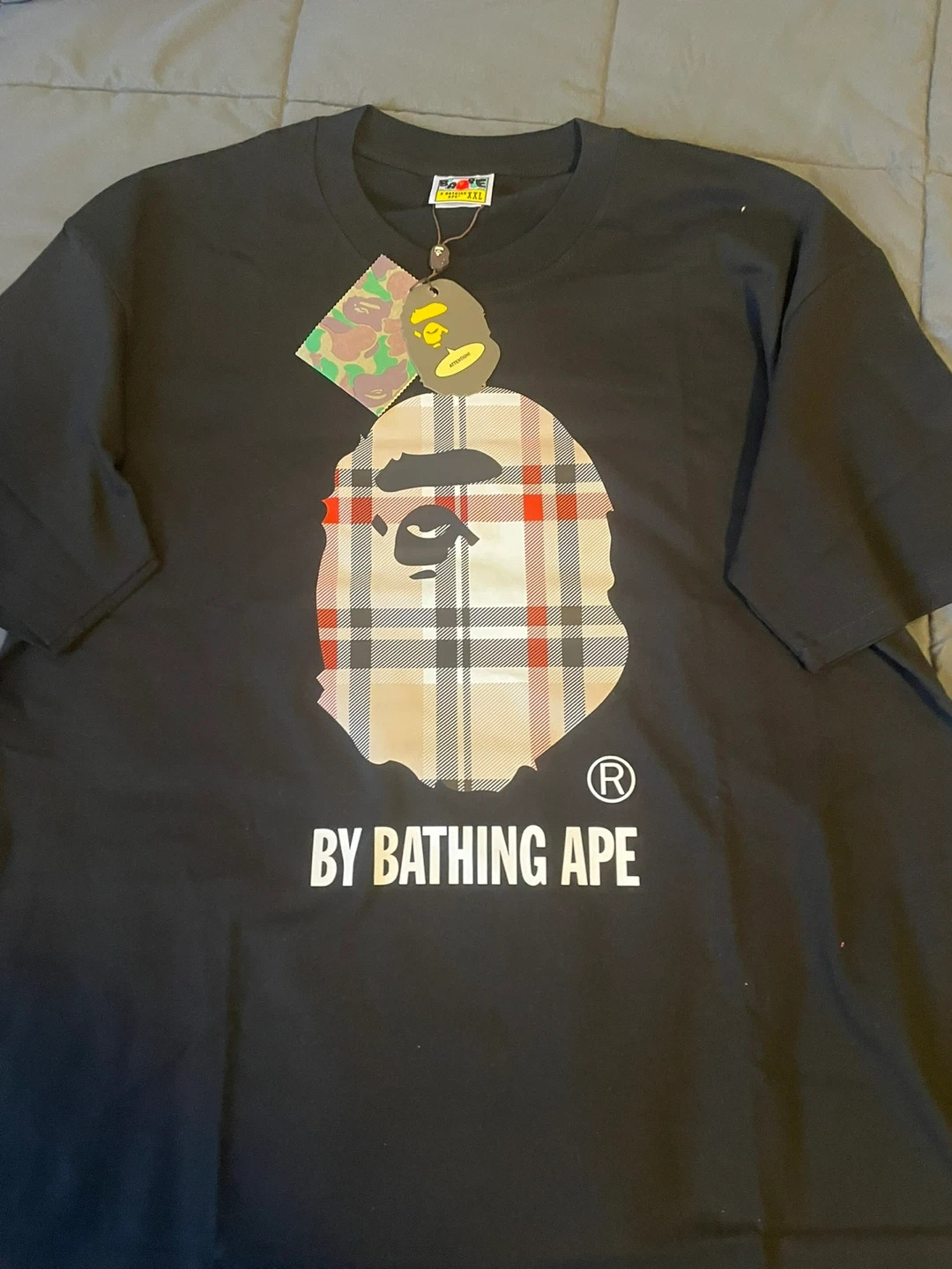 Black t-shirt by A Bathing Ape. Features the iconic ape head graphic with a plaid fill. Includes original tags and packaging. Size is XXL.