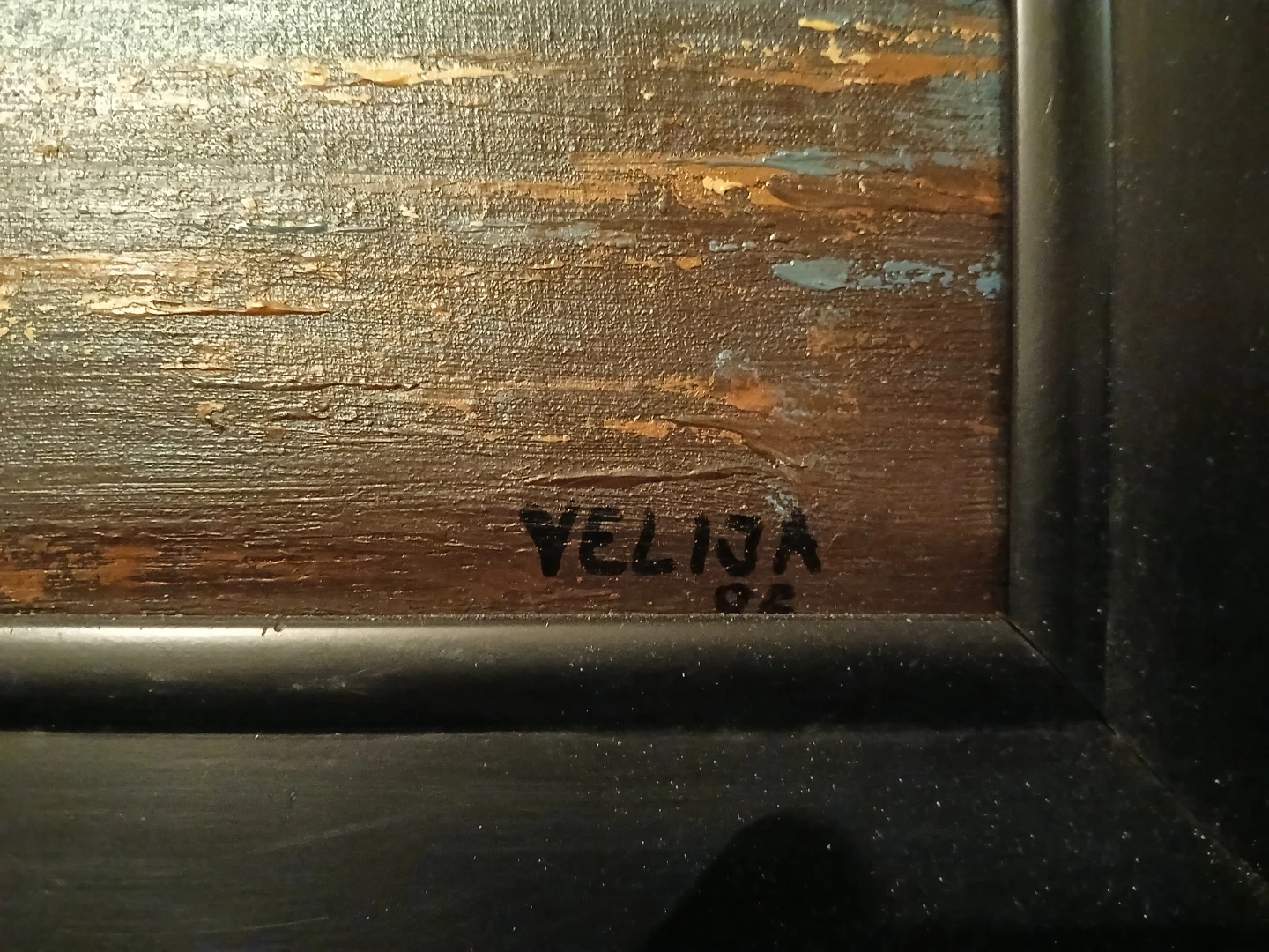 This is a framed painting depicting a seaside village scene with a boat in the foreground. The artwork is signed by the artist, VELJIA. It's a nice piece for home decor. It's in a black frame. Date:1982.