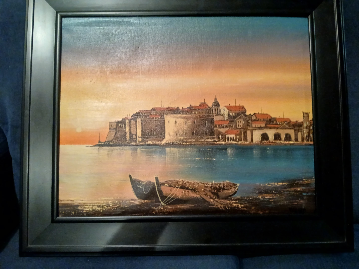 This is a framed painting depicting a seaside village scene with a boat in the foreground. The artwork is signed by the artist, VELJIA. It's a nice piece for home decor. It's in a black frame. Date:1982.