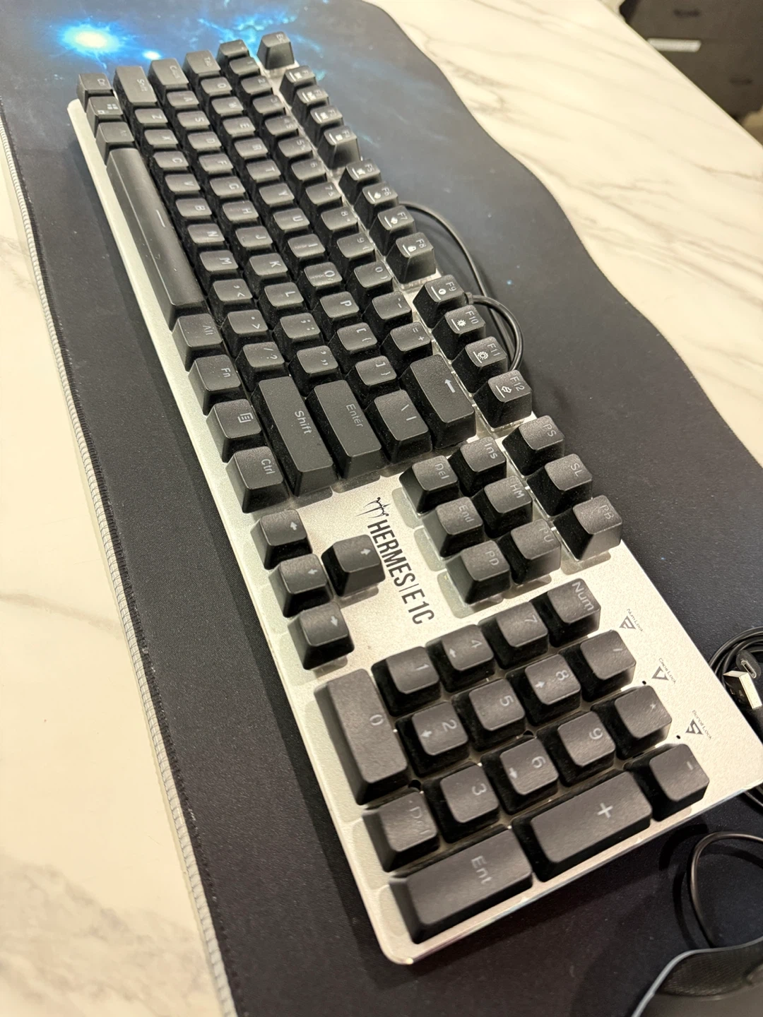 This is a Thermaltake Poseidon Z keyboard and mouse combo. The keyboard features mechanical switches and RGB backlighting. It's a great setup for gaming or everyday use! The included mouse is also designed for gaming.