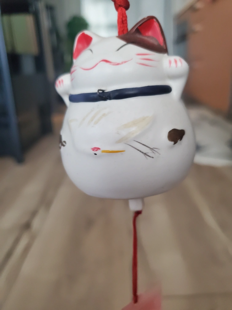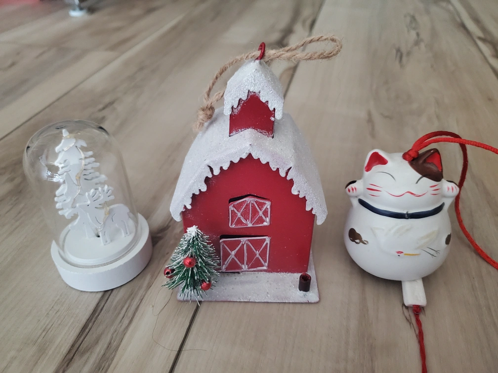 Set of 3 ornaments. Includes a snow globe with a tree and a deer inside, a small red house with a miniature Christmas tree, and a Maneki-Neko cat with a bell.