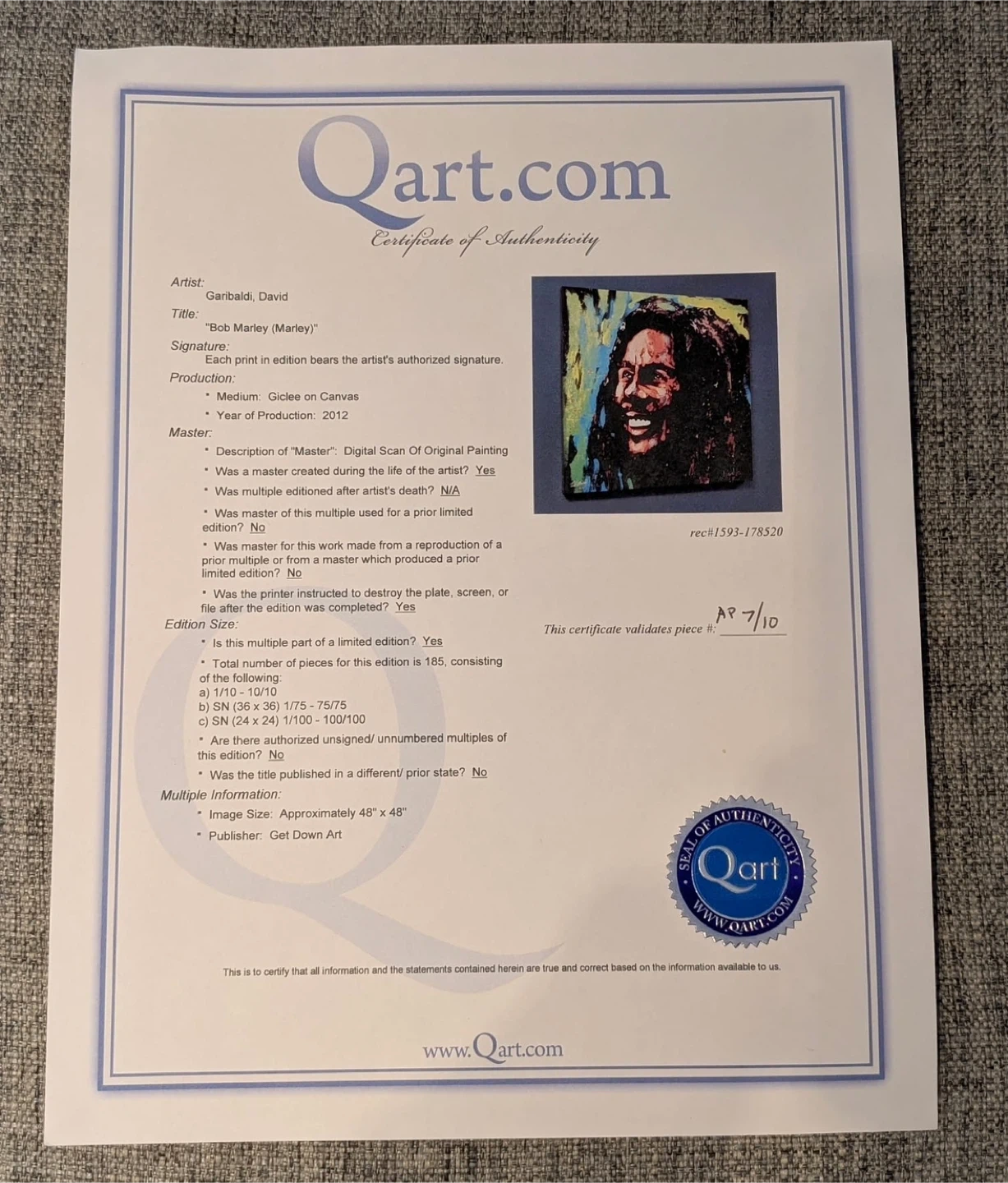 Selling a limited edition art piece by David Garibaldi, titled "Bob Marley". This is a Globe on Canvas piece from 2012. The image size is approximately 48" x 48". This certificate validates piece AP 7/10.