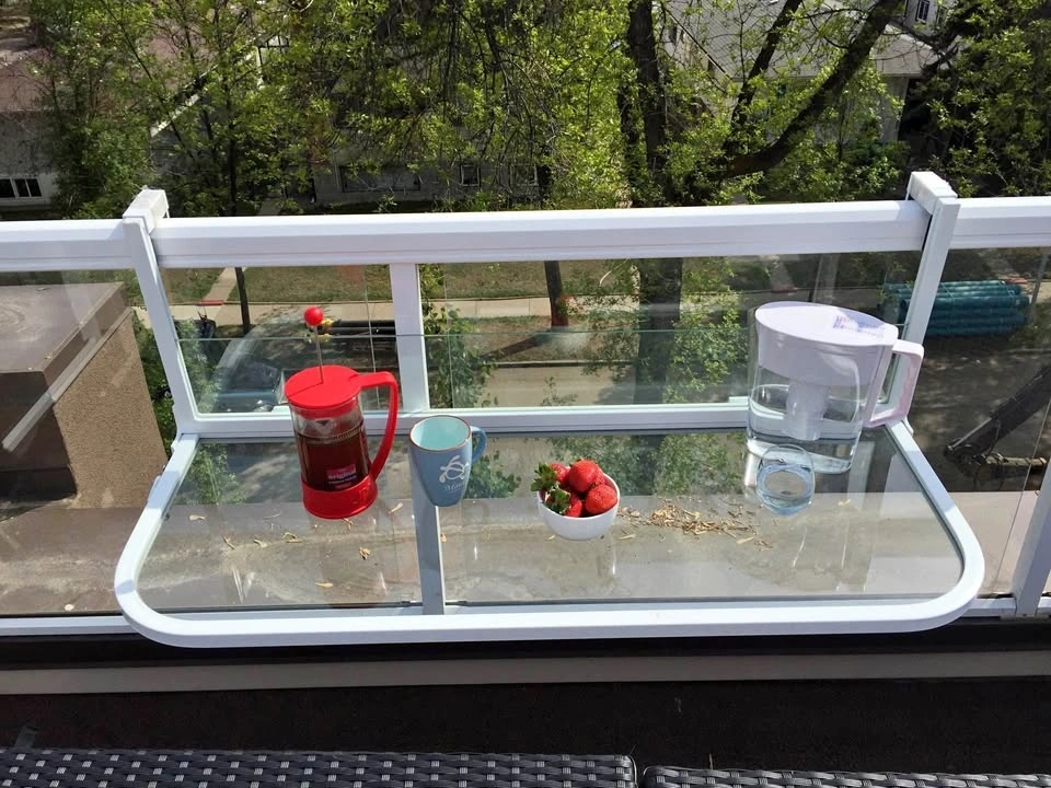 Fits any 1 to 4 inch railing securely. Made from high test Aluminum and think tempered glass. Holds up to 200 lbs of weight for your heavy plants and also locks up with a key for child safety. Comes in Tan color and limited quantities left so get yours now! Brand new in a box!