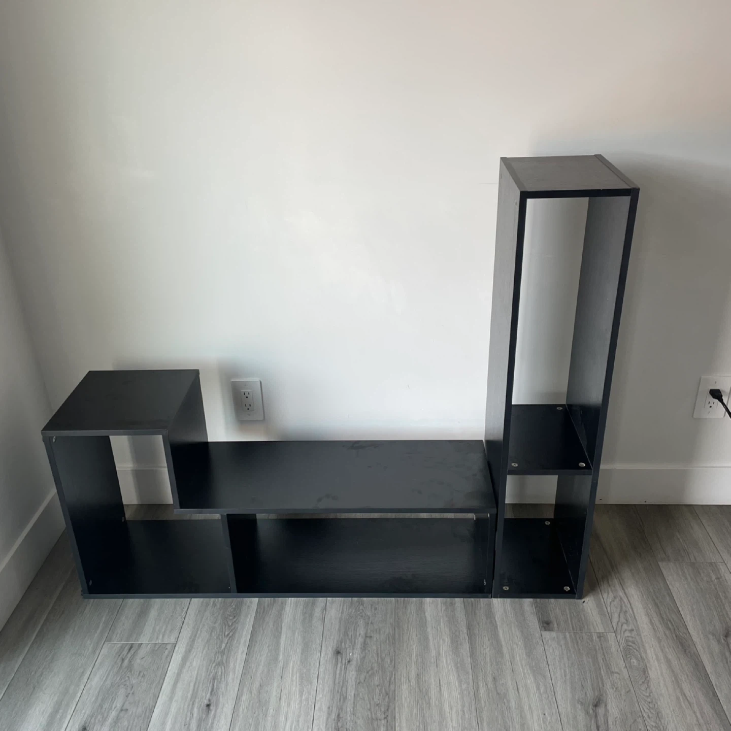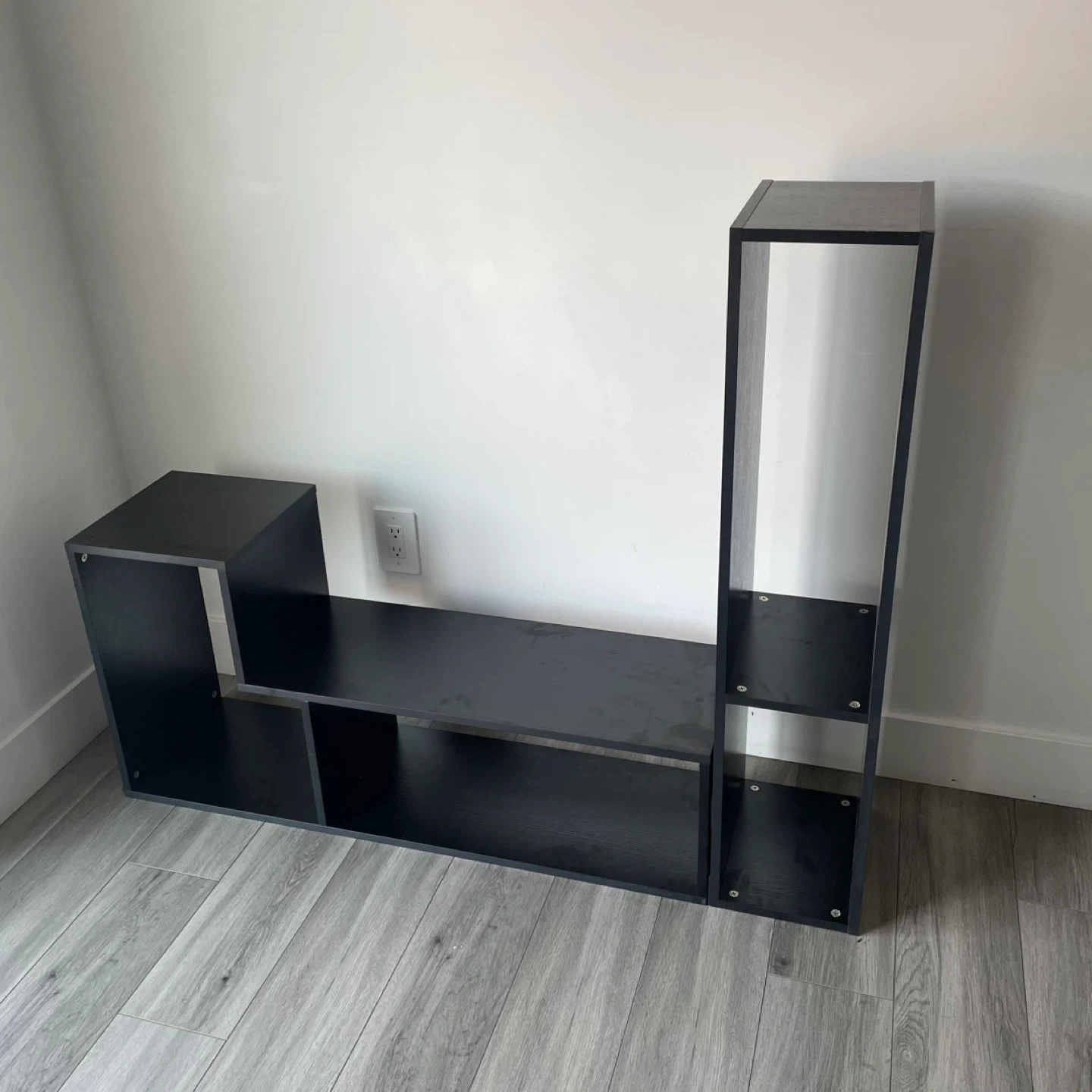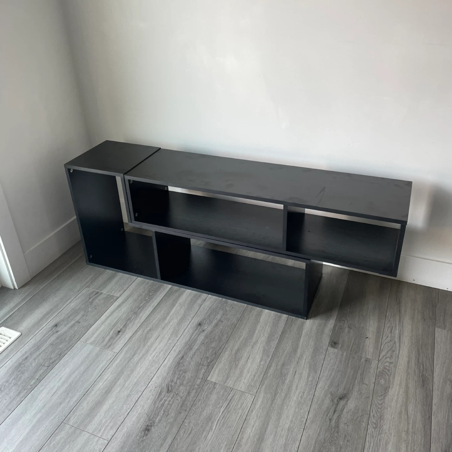 Black Modern Media Stand / Shelf Unit Asymmetrical Design with Multiple Open Compartments. Can Be Put In Different Shape And Designs. It's In Good Shape.