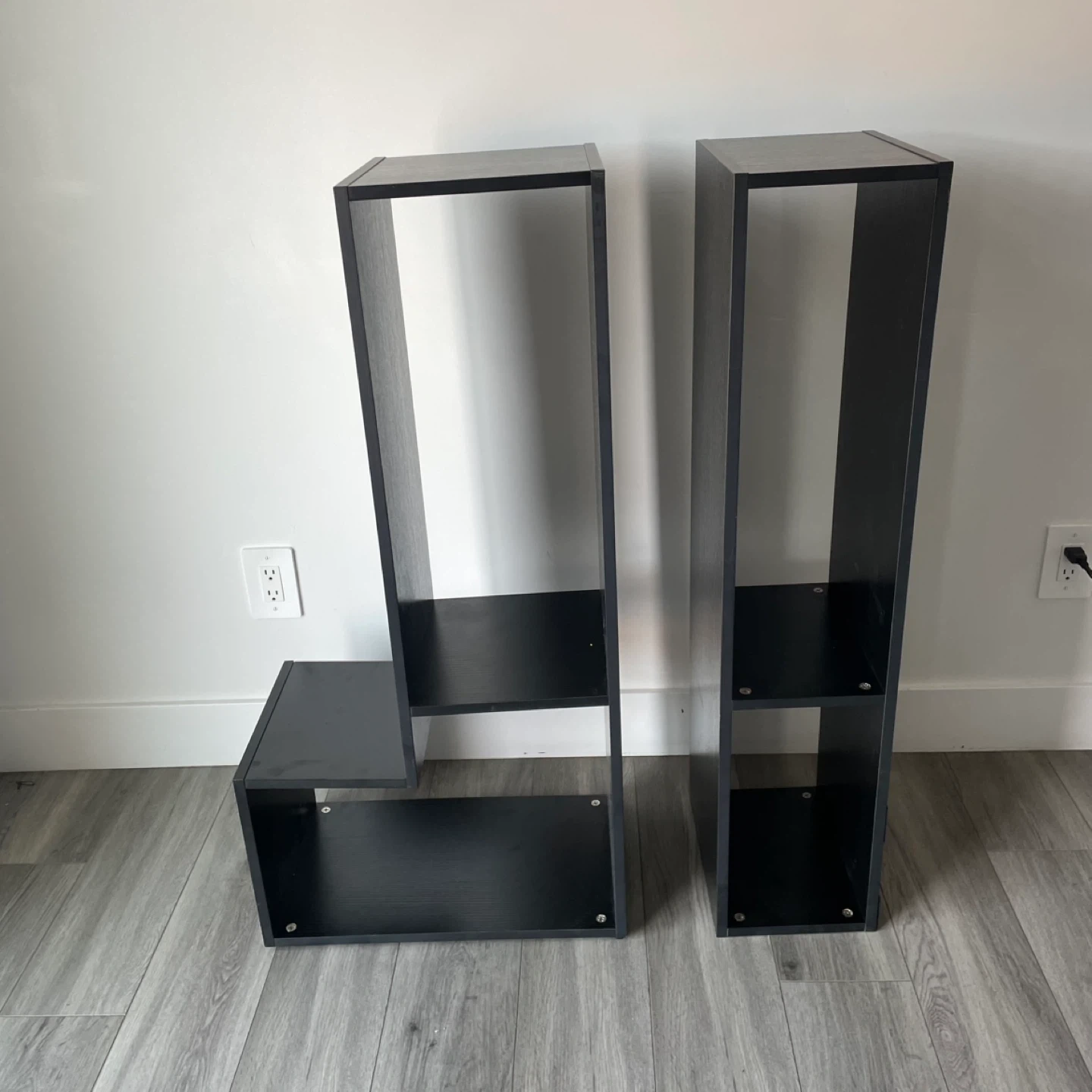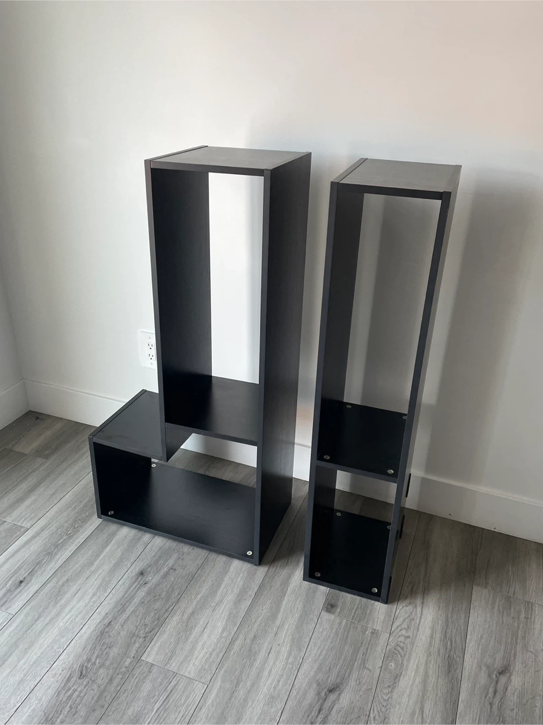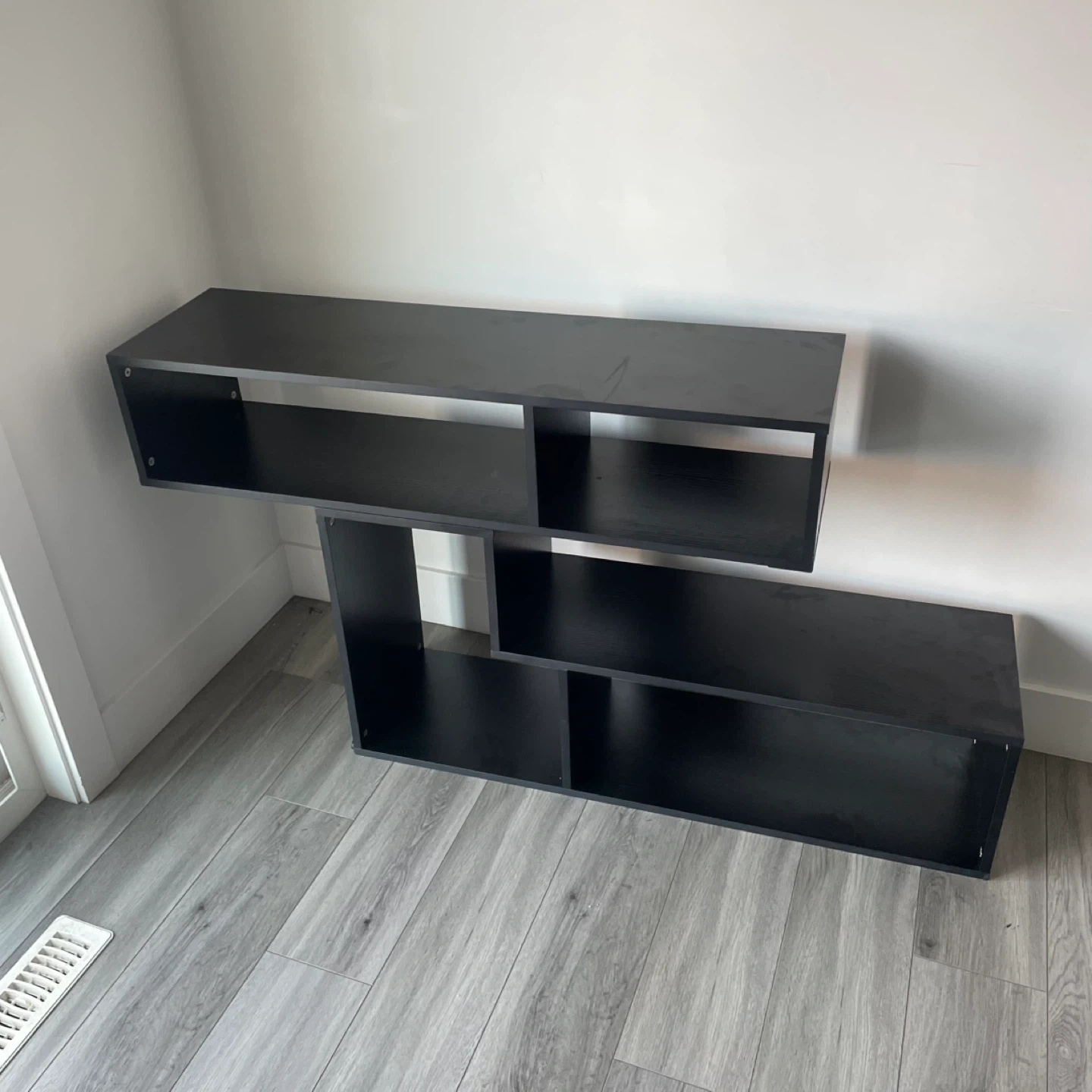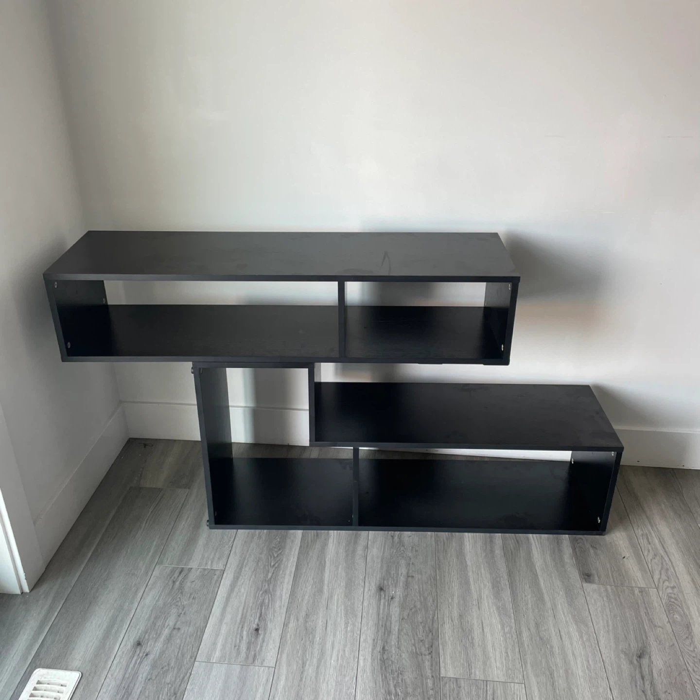 Black Modern Media Stand / Shelf Unit Asymmetrical Design with Multiple Open Compartments. Can Be Put In Different Shape And Designs. It's In Good Shape.