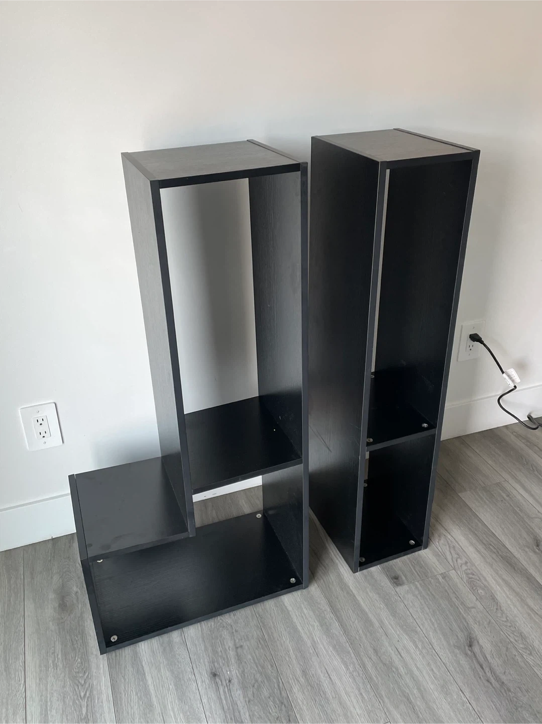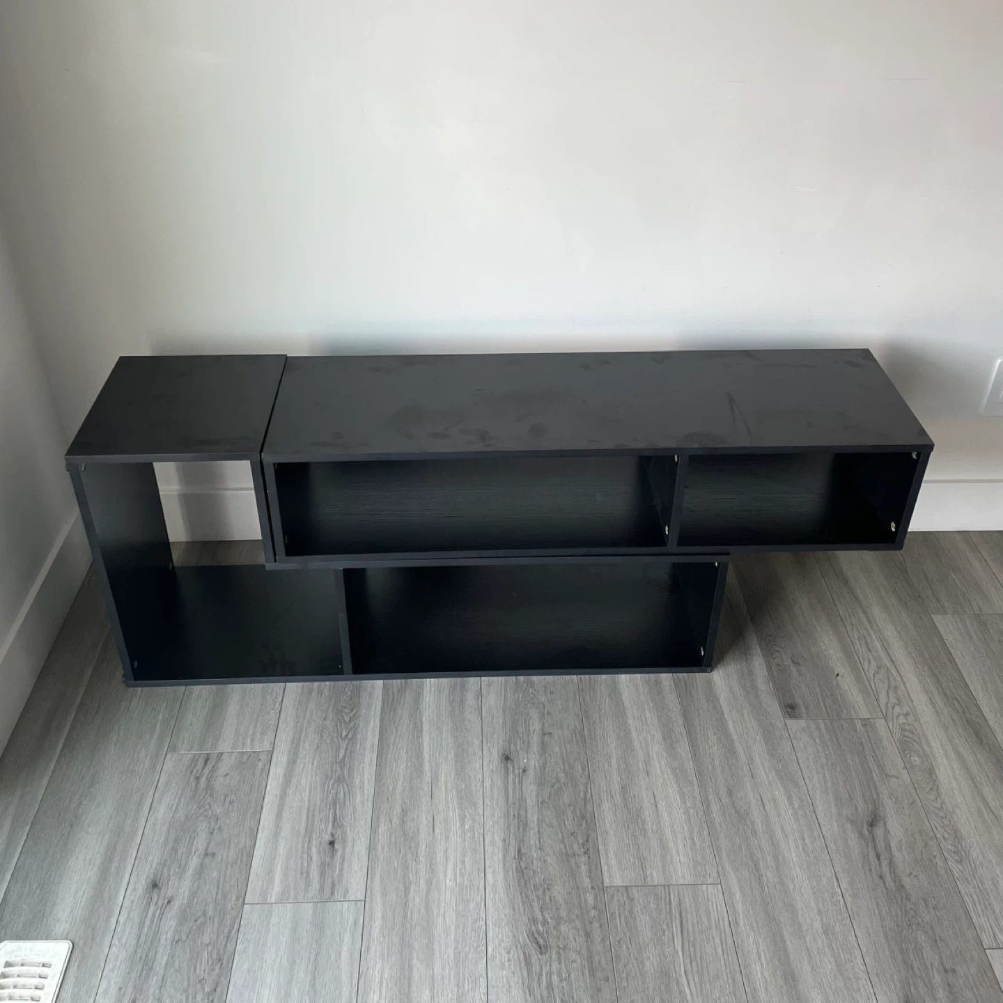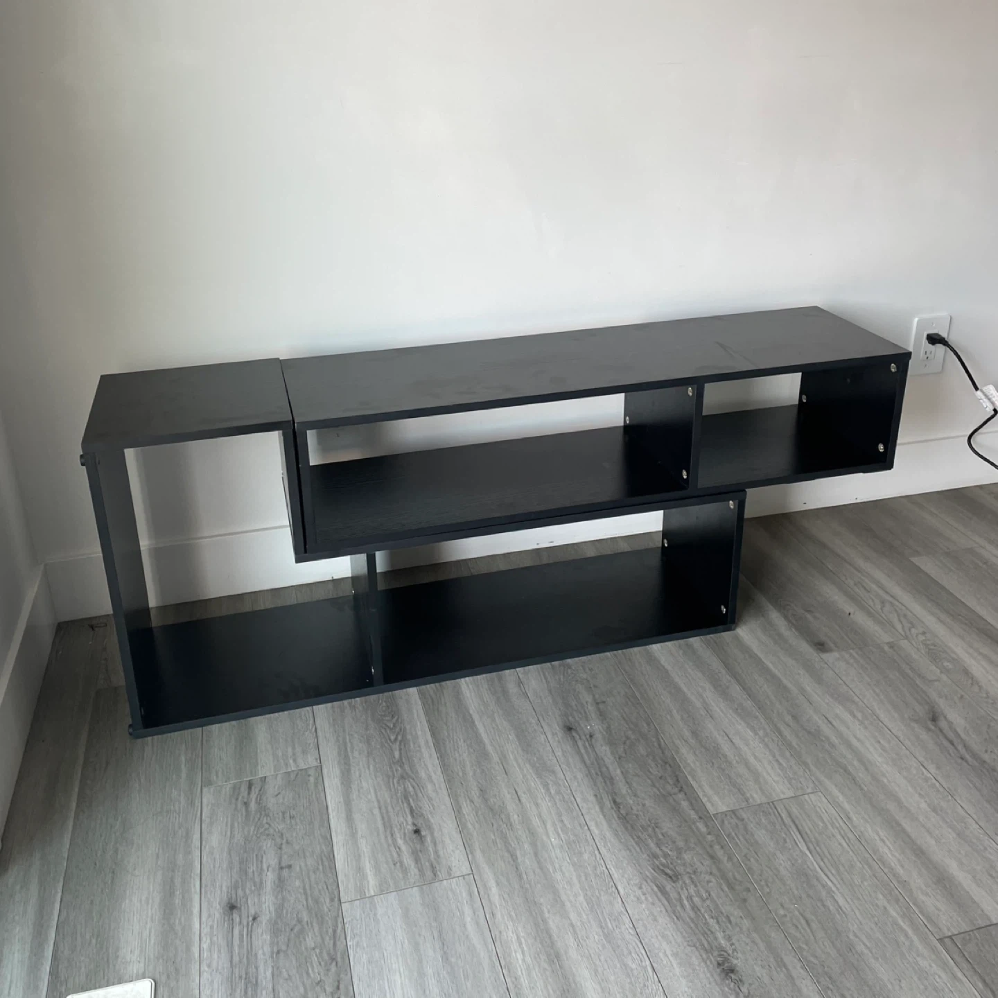 Black Modern Media Stand / Shelf Unit Asymmetrical Design with Multiple Open Compartments. Can Be Put In Different Shape And Designs. It's In Good Shape.
