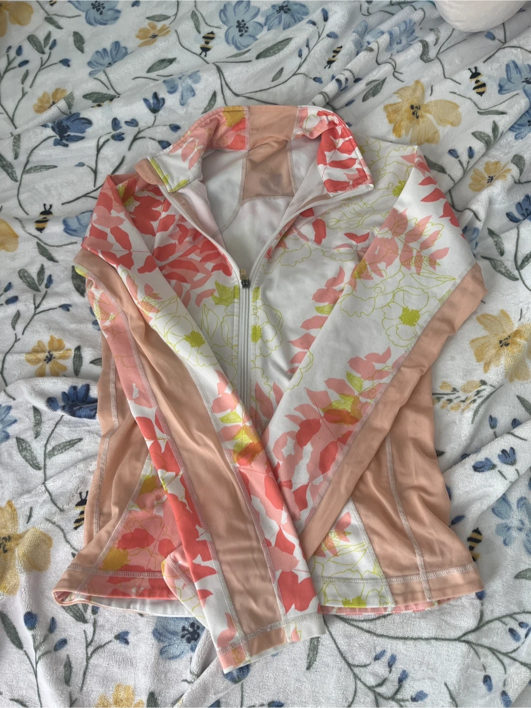 This Lululemon track jacket features a colourful floral print with peach accents. It has a full zip closure and two zippered pockets. A great piece for light workouts or casual wear! Pick up cash only