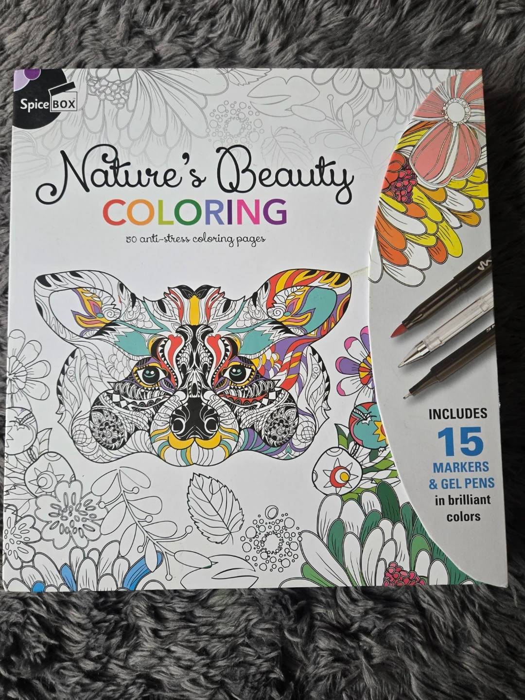 2 intricate animal/nature coloring books, one cones with 5 gel pens, 5 fine tip markers, and 5 brush tip markers.