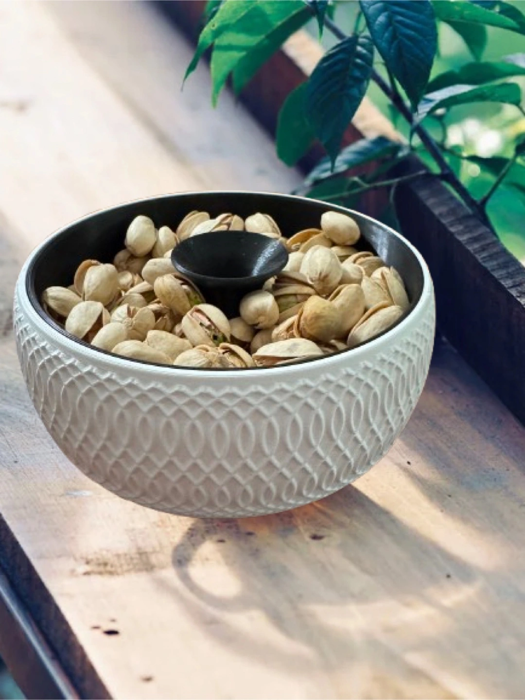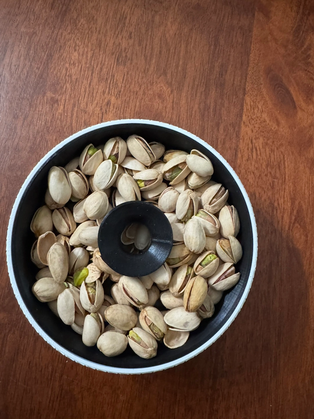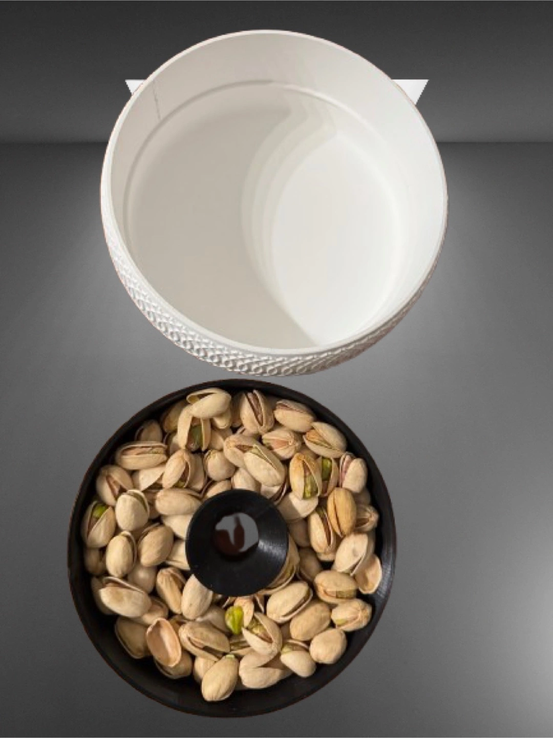 Hidden Shell Storage: The top tier holds your fresh nuts, while the center funnel lets you "tuck away" empty shells into the hidden bottom chamber. 5 1/2” round.