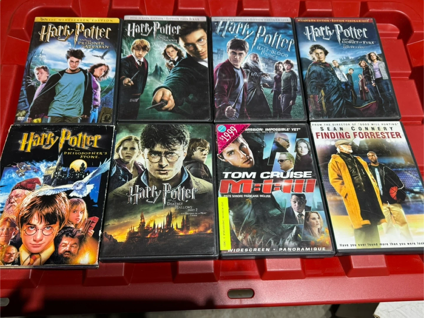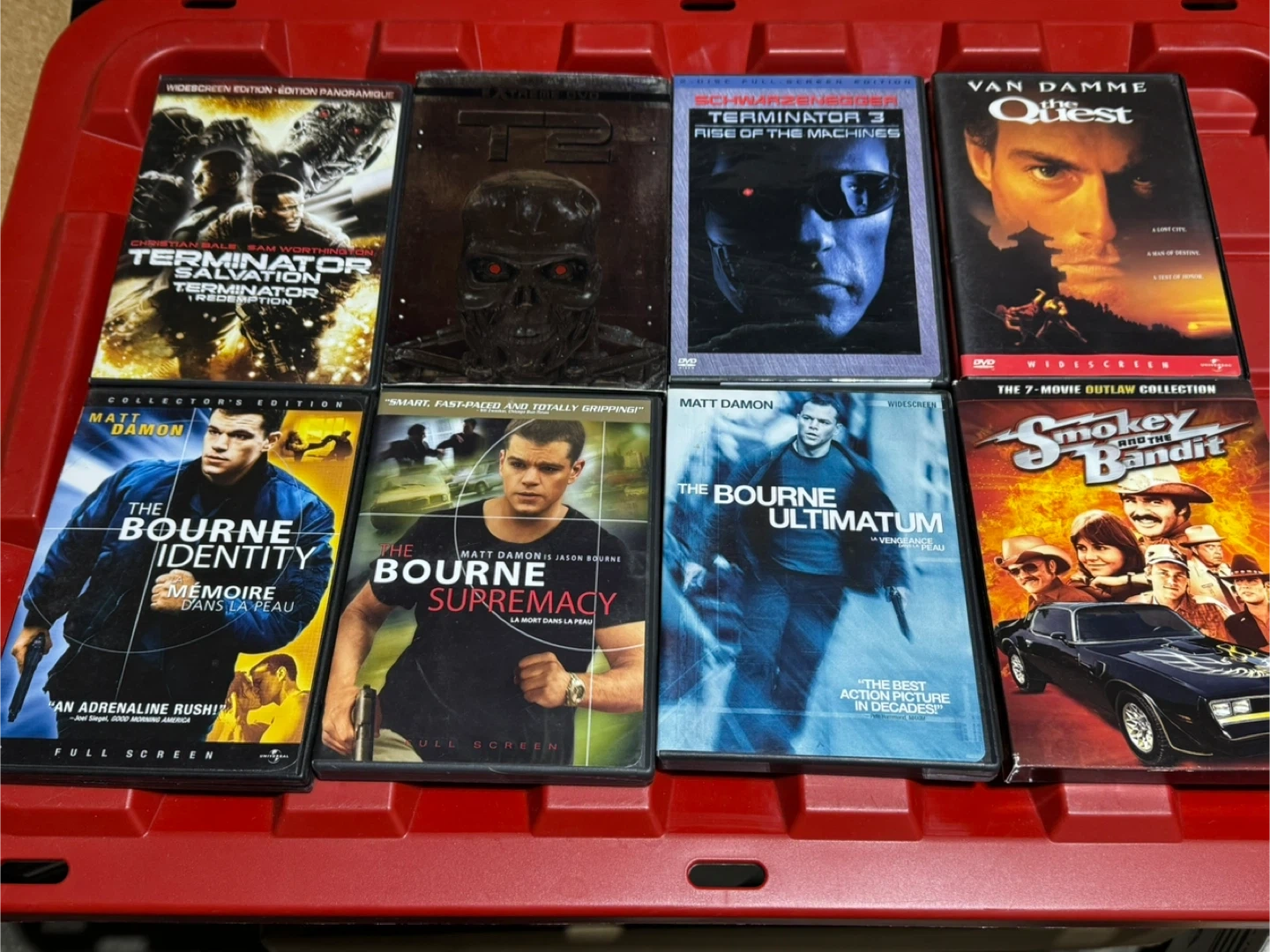 A collection of various DVD movies including action, sci-fi, and comedy genres. Titles include Terminator, Bourne series, Harry Potter, and more. These are all standard DVD format discs. $120 for all or $5 each