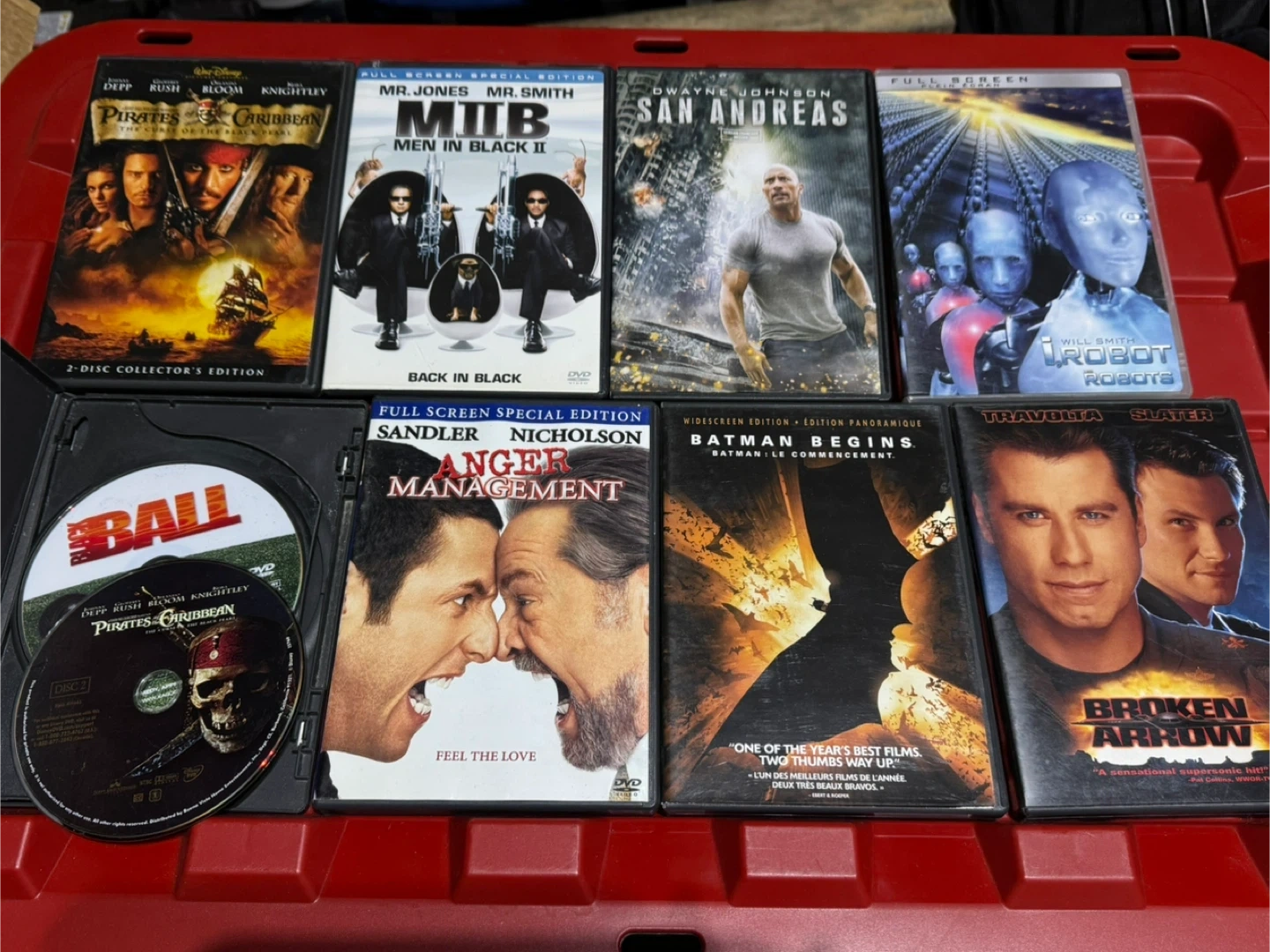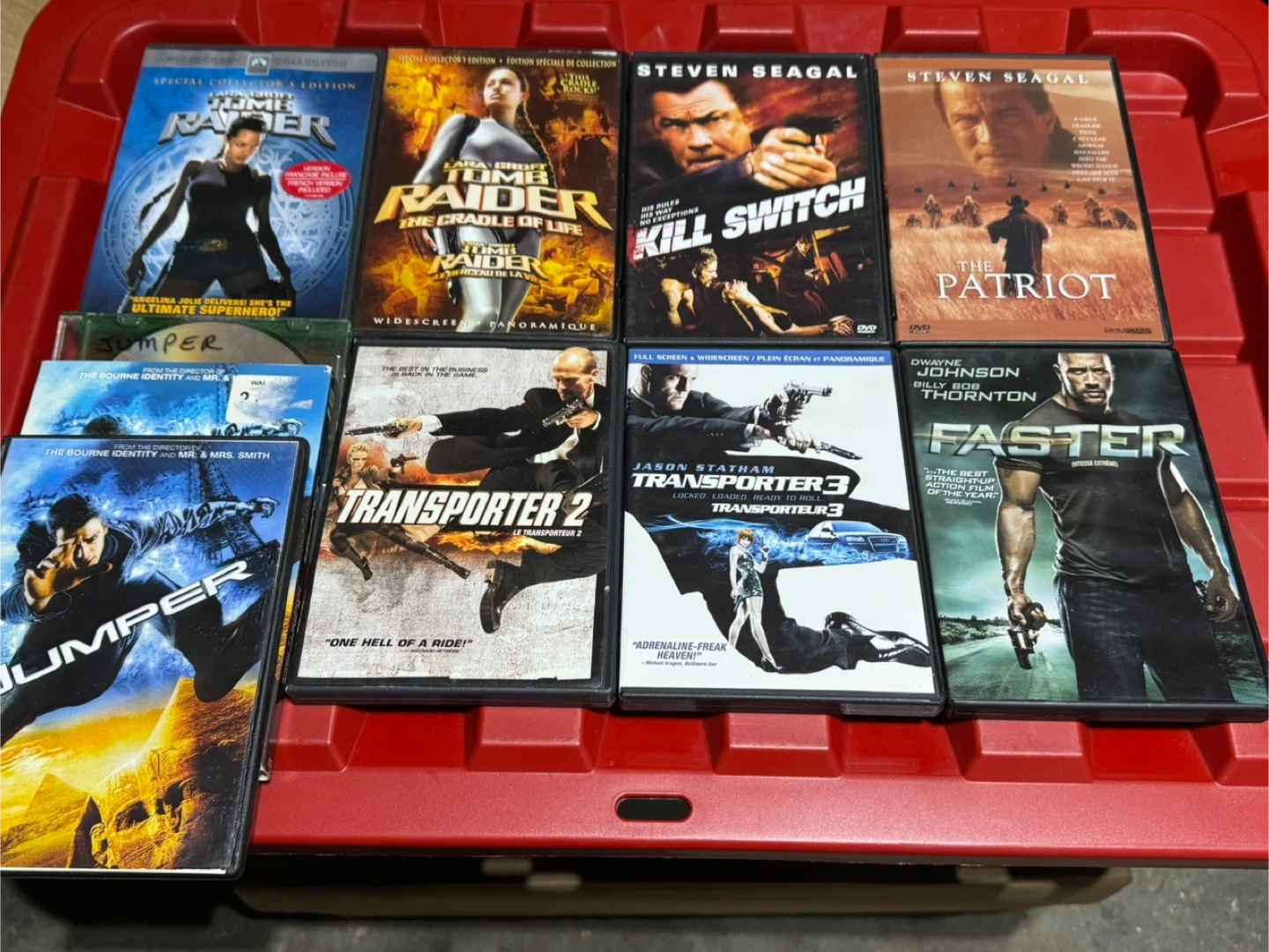 A collection of various DVD movies including action, sci-fi, and comedy genres. Titles include Terminator, Bourne series, Harry Potter, and more. These are all standard DVD format discs. $120 for all or $5 each