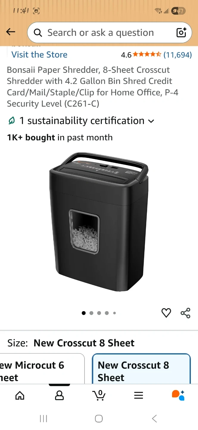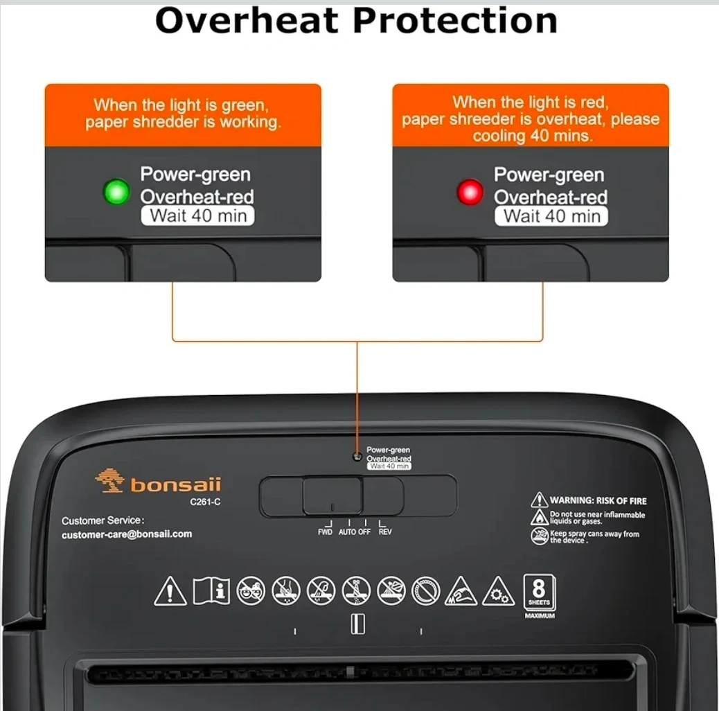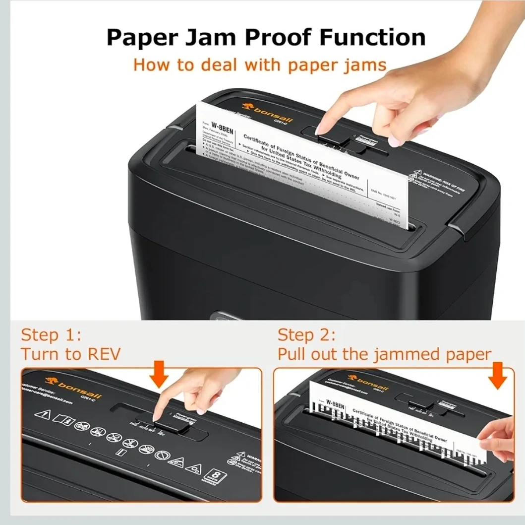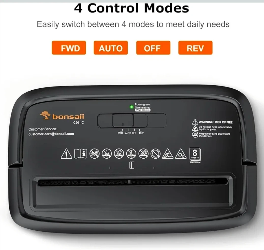 This Bonsaii paper shredder features an 8-sheet crosscut capacity and a 4.2-gallon bin. It shreds paper into 5x18mm particles and has a 4-minute runtime with a 40-minute cooldown. Its compact size makes it suitable for home office use.