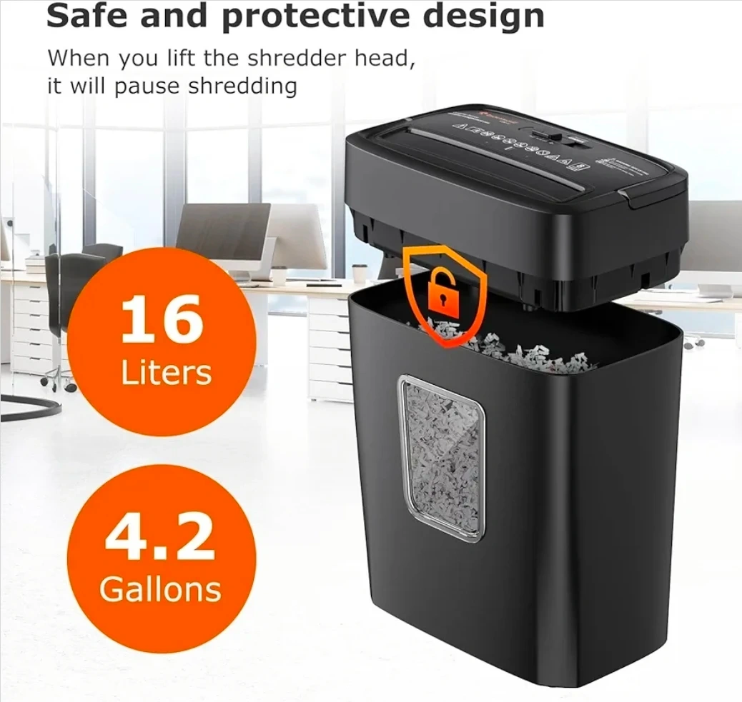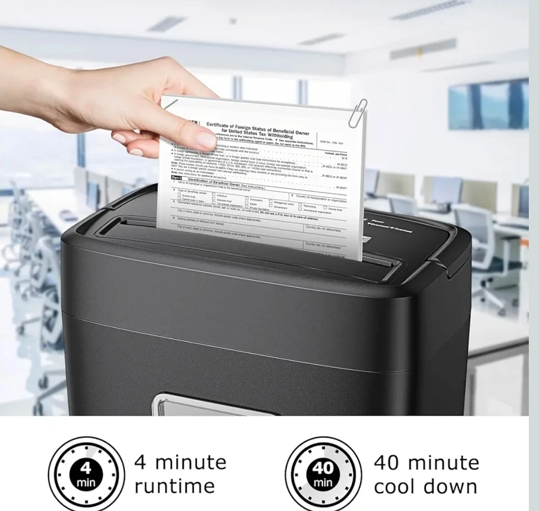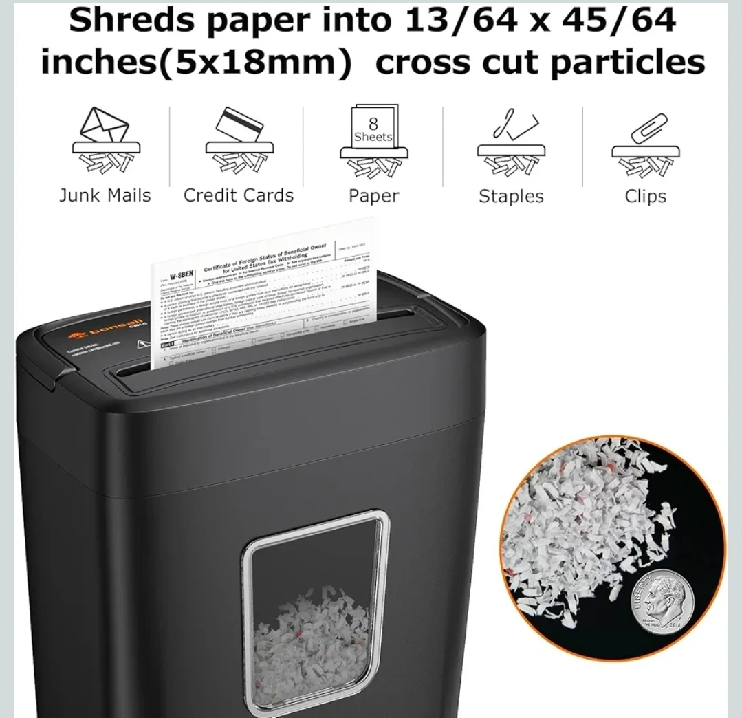 This Bonsaii paper shredder features an 8-sheet crosscut capacity and a 4.2-gallon bin. It shreds paper into 5x18mm particles and has a 4-minute runtime with a 40-minute cooldown. Its compact size makes it suitable for home office use.