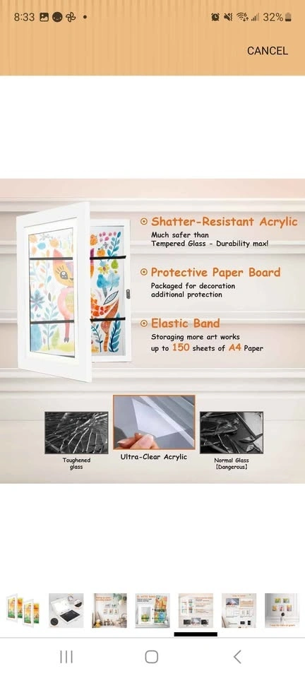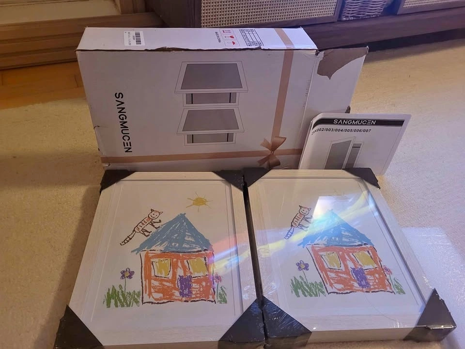 Brand new, still in plastic seal, 2-pack of kids artwork frames. These are changeable and front-opening, perfect for displaying your little one's masterpieces. Each frame holds up to 150 sheets of 8.5 x 11 inch paper. They have shatter-resistant acrylic and an elastic band inside for storing extra art. White frames. Cash only. Pick up in lobby near Yonge and Sheppard.