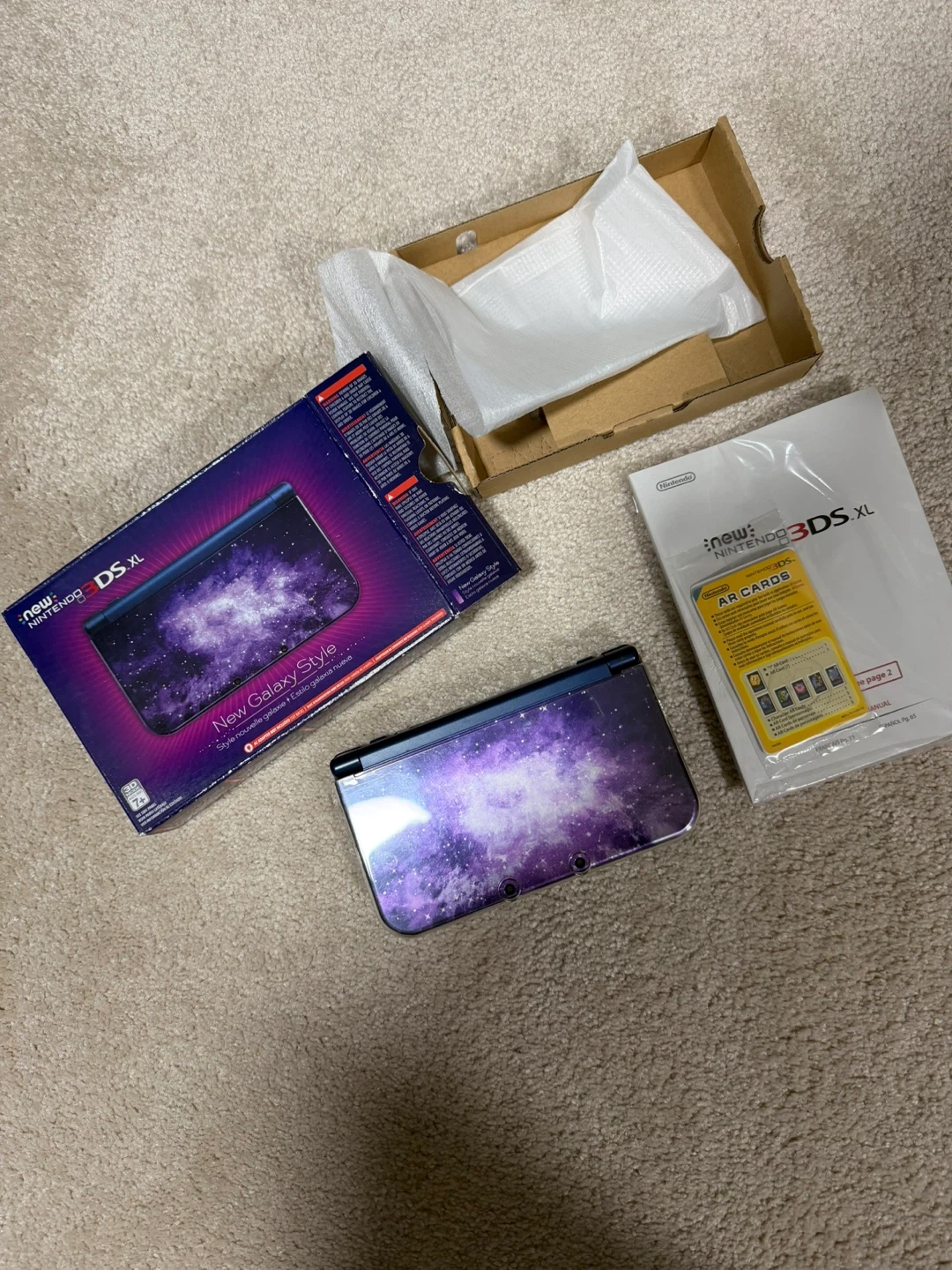 Selling Nintendo 3DS XL in the Galaxy Style. It's a great handheld console for gaming on the go. Includes original box ,AR Cards and Manual (CIB) also has screen protectors on and a clear hardshell case