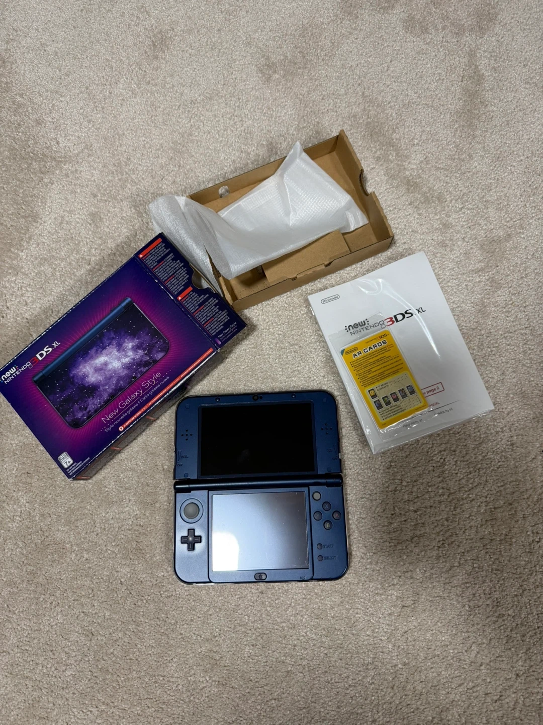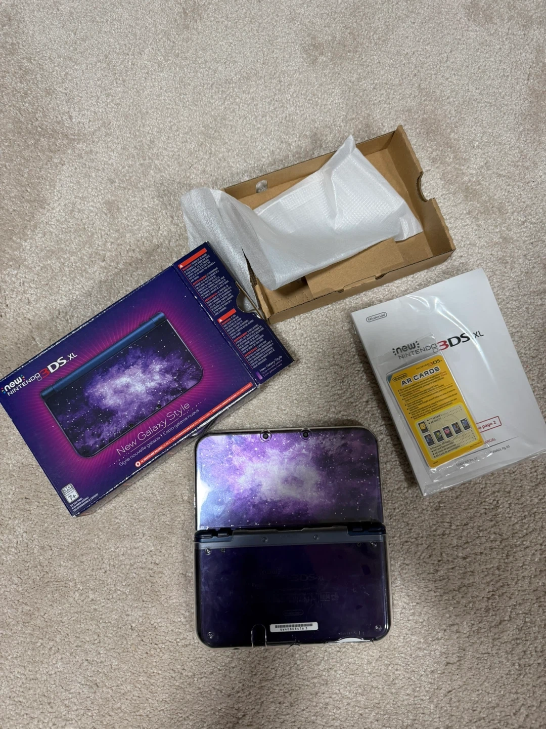 Selling Nintendo 3DS XL in the Galaxy Style. It's a great handheld console for gaming on the go. Includes original box ,AR Cards and Manual (CIB) also has screen protectors on and a clear hardshell case