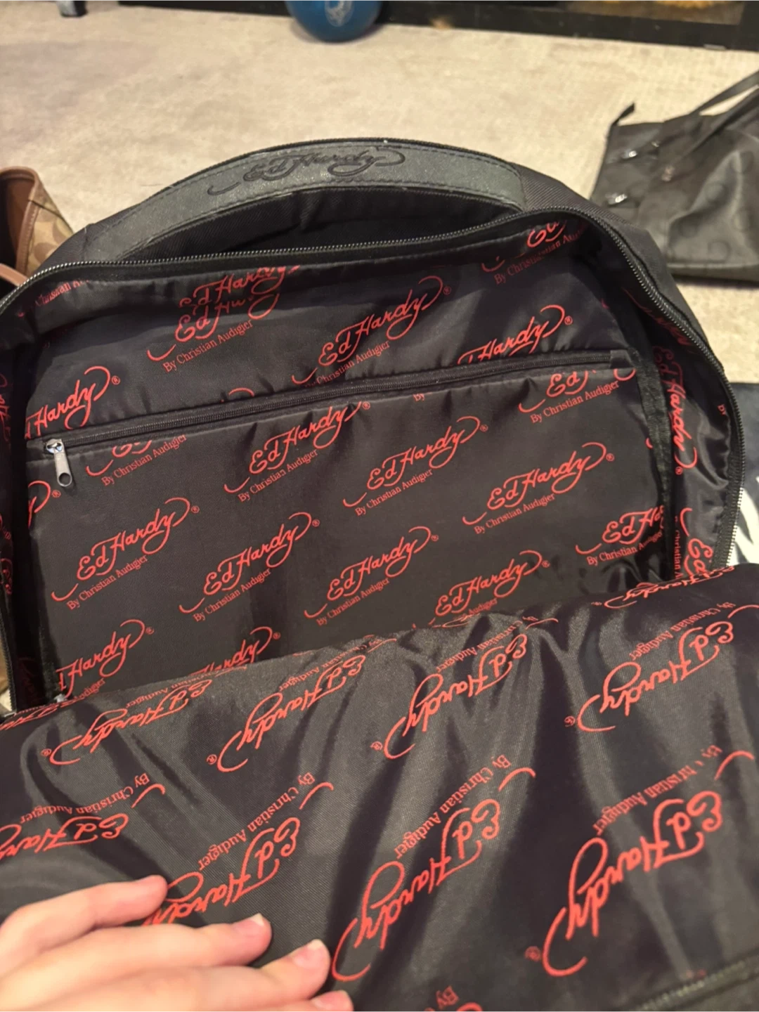 Black Ed Hardy backpack featuring the iconic skull and heart graphic. Interior lining is branded with "Ed Hardy By Christian Audigier". It has a zippered main compartment and a front pocket with unique zipper pulls.