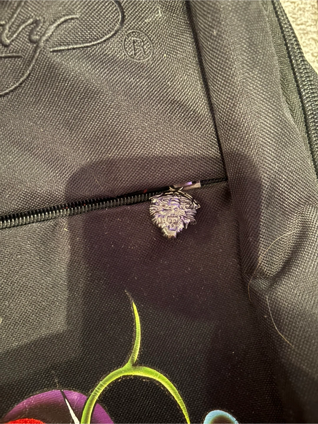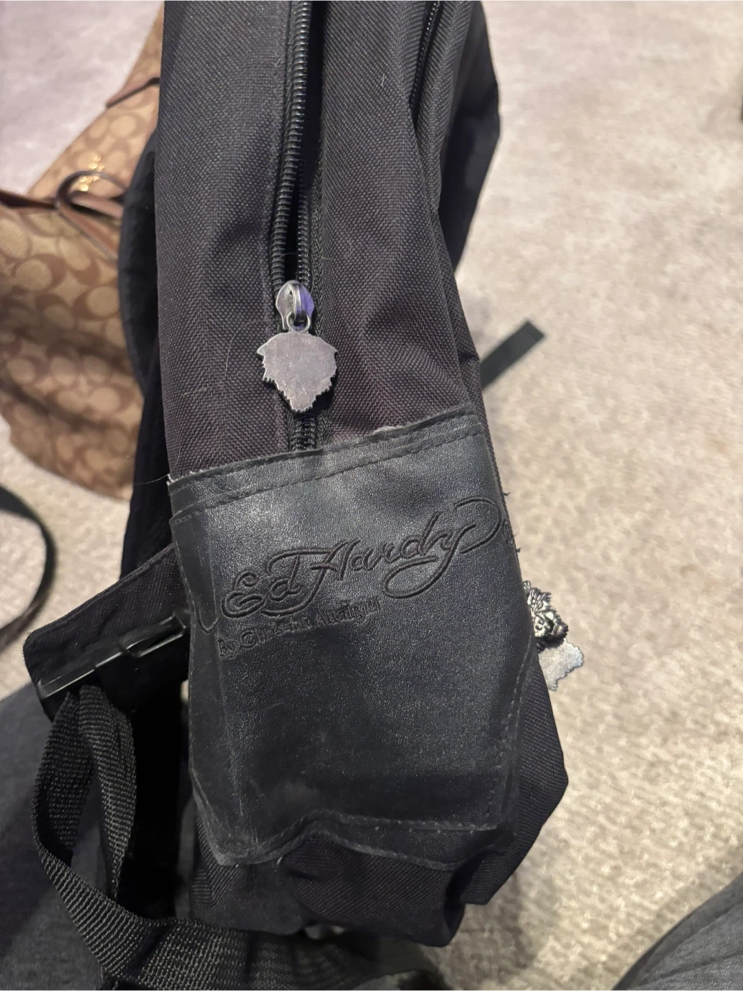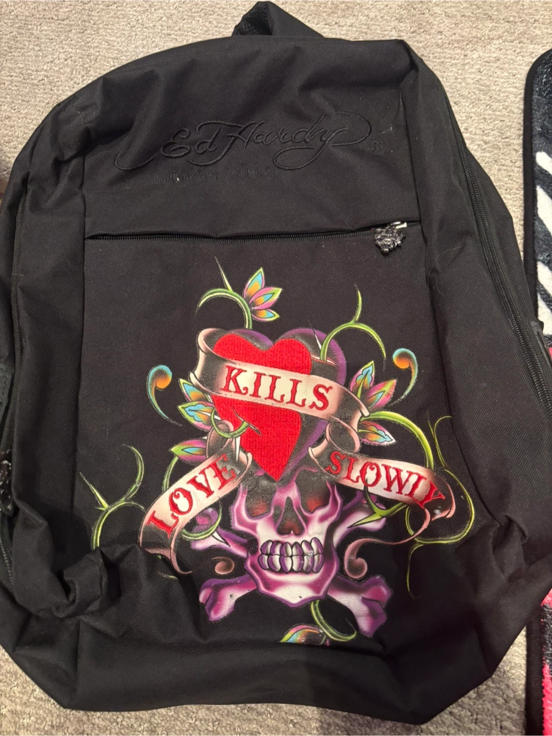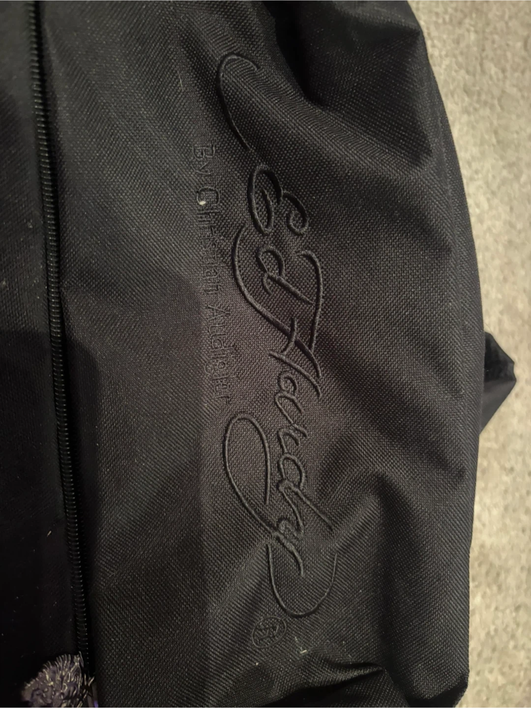 Black Ed Hardy backpack featuring the iconic skull and heart graphic. Interior lining is branded with "Ed Hardy By Christian Audigier". It has a zippered main compartment and a front pocket with unique zipper pulls.